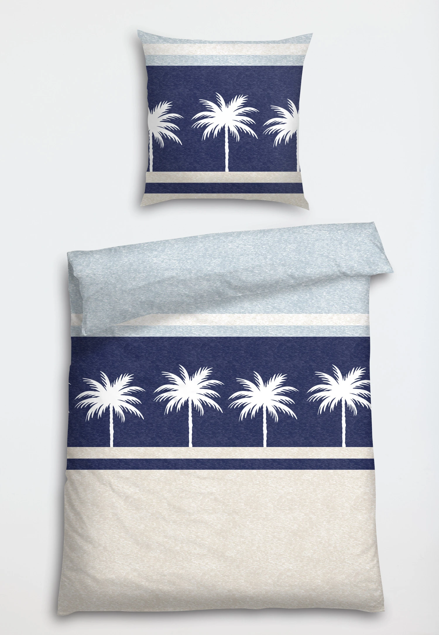 Fine satin made from 100% cotton meets a fashionable design in this 2-piece bed linen set. Palm trees dot the fine sand like on a beach boulevard, giving your pillows and duvets that hint of summer. Coming in muted colors such as navy blue, beige and white, this bed set gives every bedroom a stylish look. The high-quality zipper is a practical detail. Perfect for relaxing nights in the best SCHIESSER quality!
