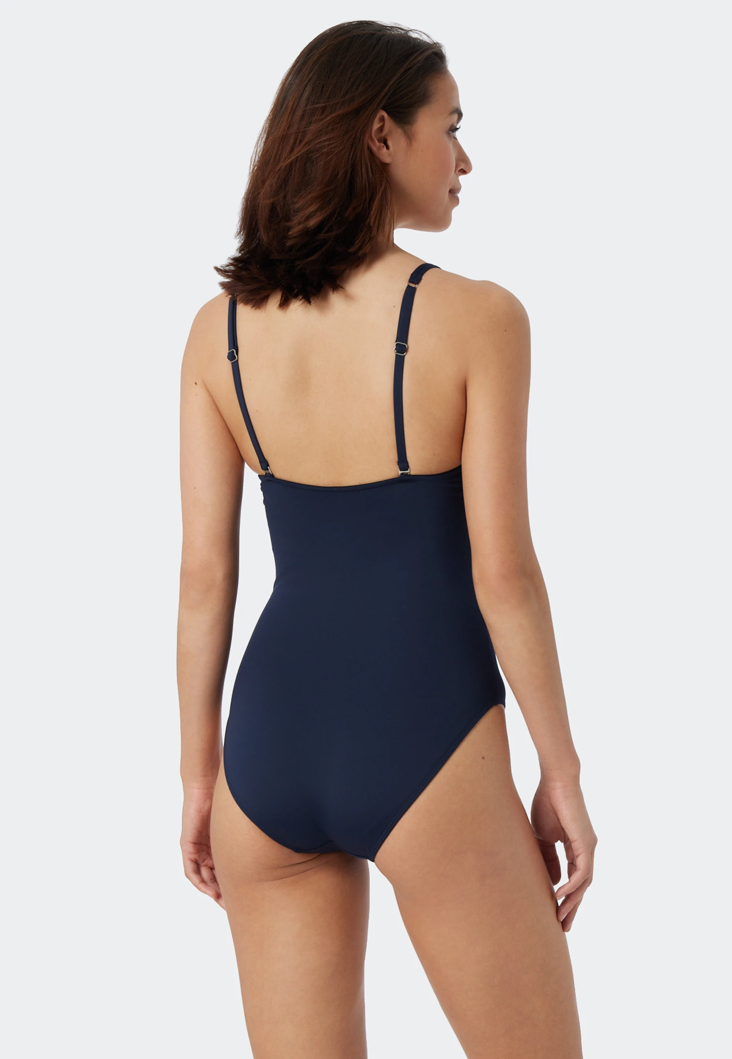 This dark blue bandeau swimsuit for women is a feminine classic! With its soft cups with support, it creates wonderful cleavage. Integrated underwire and an internal silicone band provide gentle support. At the same time, the one-piece suit is a real winner when it comes to flexibility: it can be worn without straps or with straight or crossed straps. The summer dream made of recycled material with spandex is also sustainable. Beachwear in the best SCHIESSER quality!