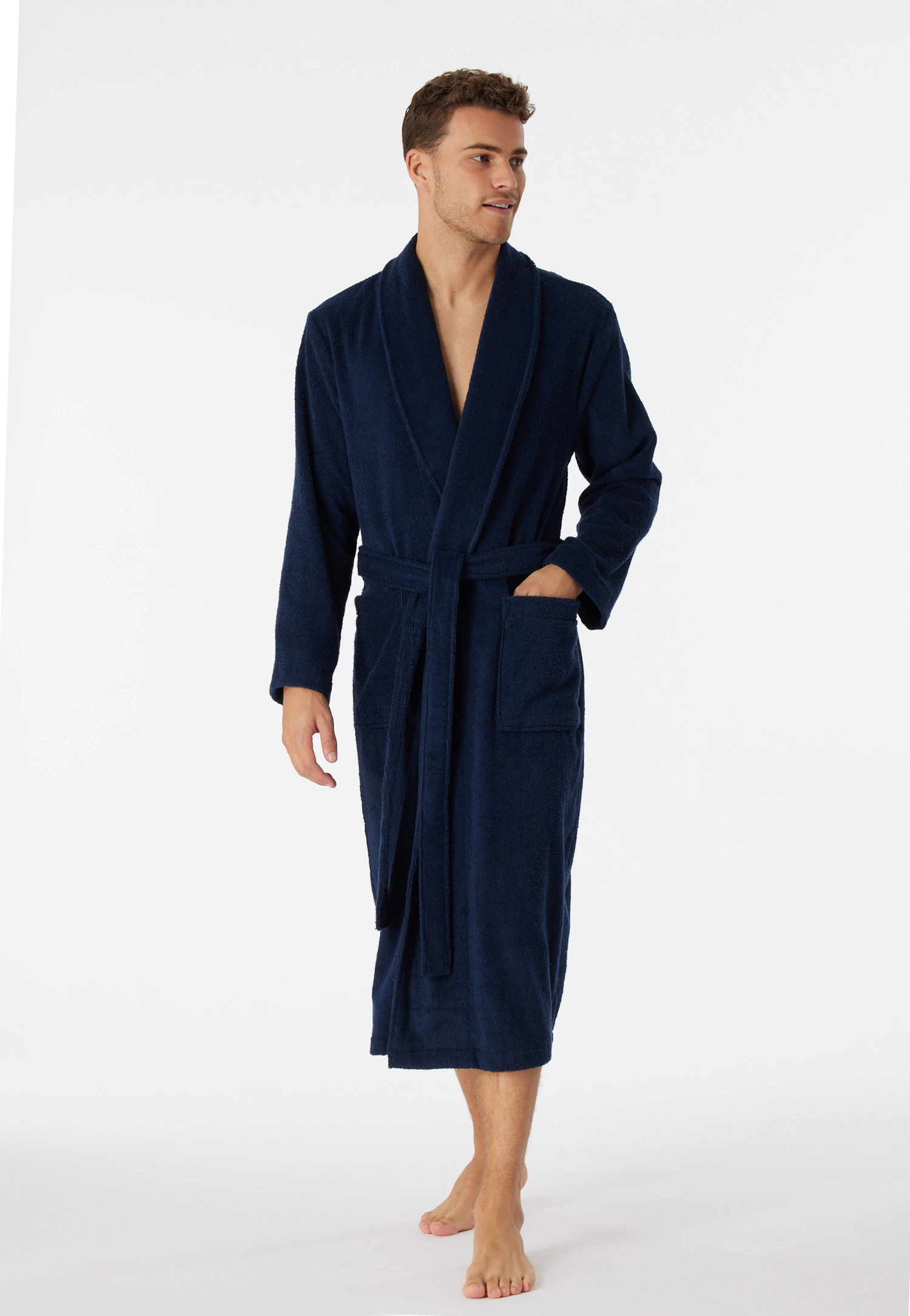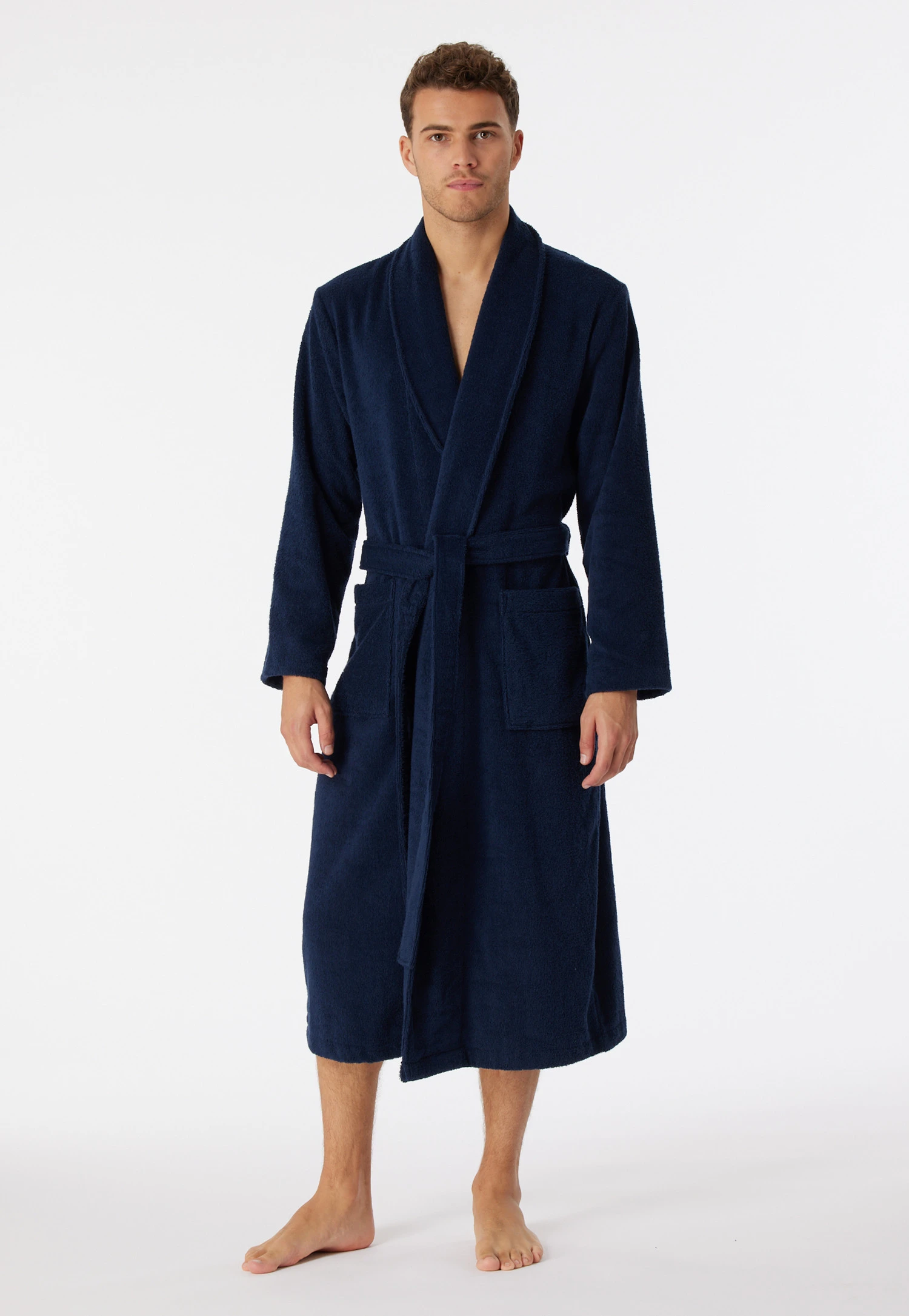 Let us introduce… our men’s bathrobe for all occasions! The high-quality, warming terry cloth made from 100% sustainable cotton creates a cozy feeling on your skin and features such practical details as a shawl collar, a tie belt and two patch pockets. Whether you wear it after a shower, at the spa or while reading the newspaper in the morning – this terry cloth robe is always the right companion for you!