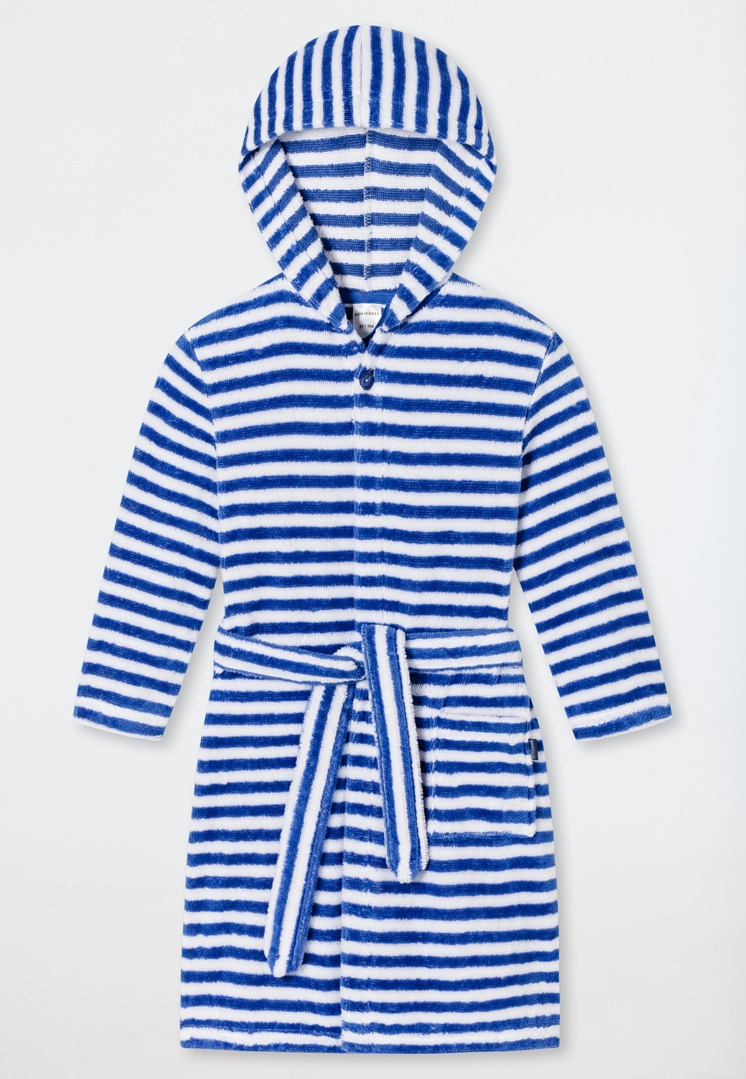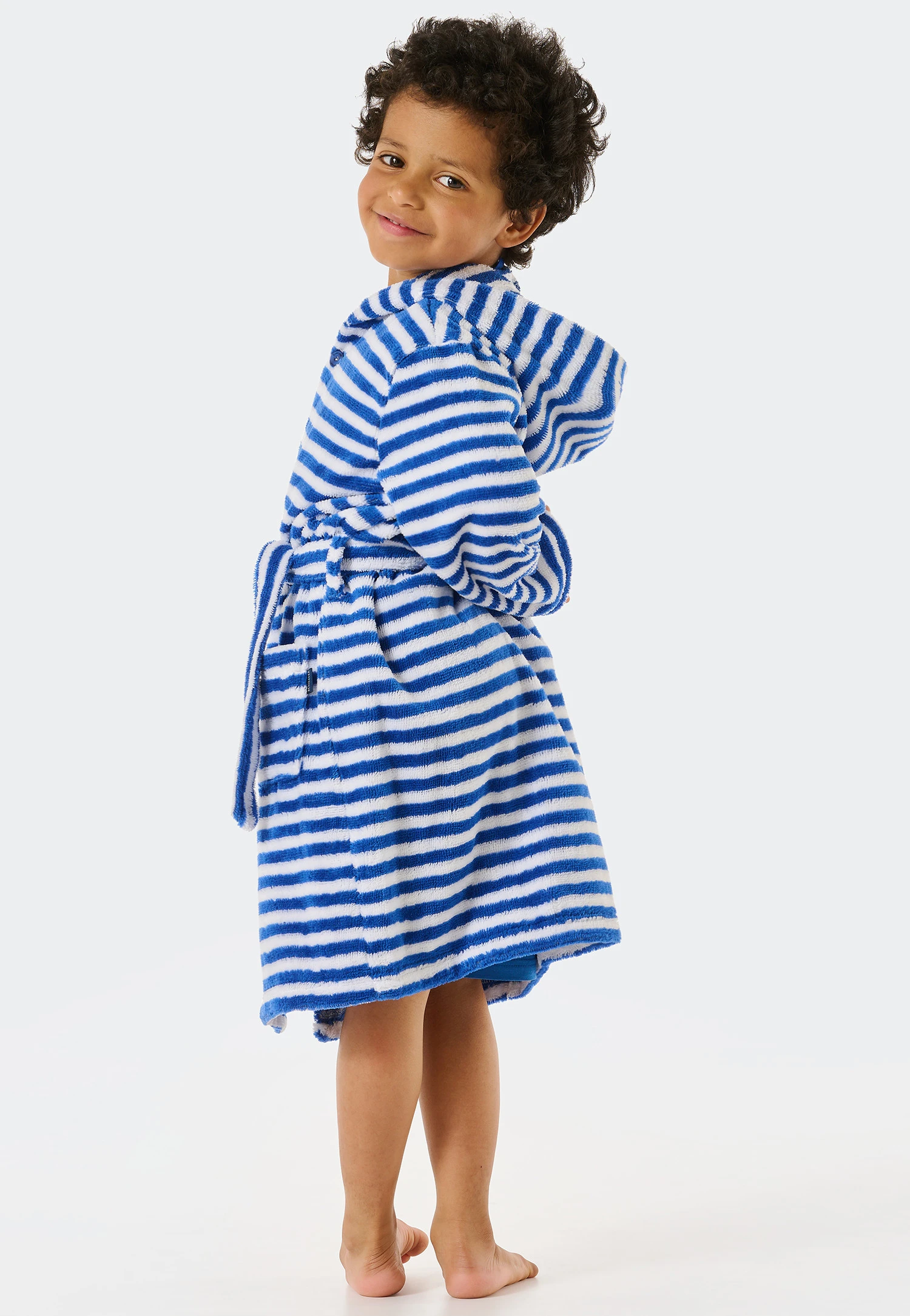Slip it on and snuggle up! This attractive boys’ bathrobe invites you to relax and feel good. The robe conjures up a great deal of maritime atmosphere with its cheerful striped look in aqua blue and white. Equipped with absorbent terry cloth on the inside and soft woven velour on the outside, this robe will become a real favorite item that’ll satisfy across the board with such practical details as its hood, its tie belt and its high-quality button. Lots of stripy fun in the best SCHIESSER quality.
