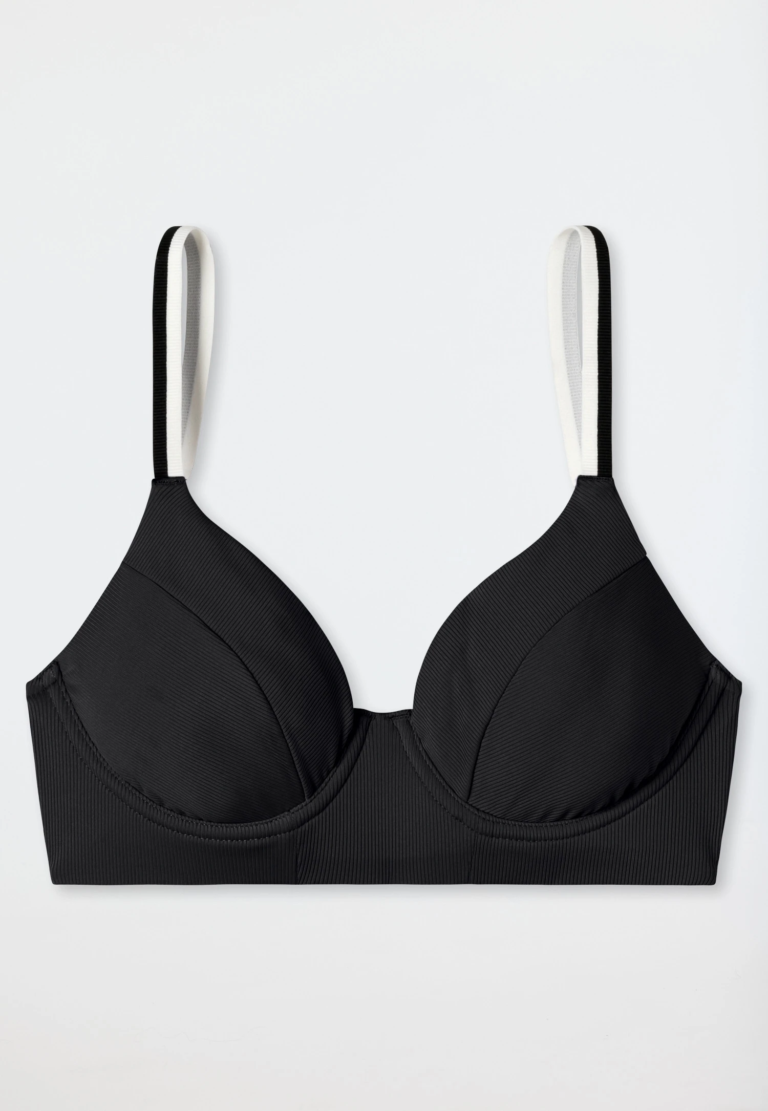 Sporty retro style: this underwire bikini top is your new summer favorite! With its fashionable rib look and black and white striped straps, it simply cuts a fine figure. At the same time, it’s wonderfully flexible: the straps can be worn straight, crossed or as a halter neck. The underwire and soft lining ensure a perfect fit. The top doesn’t have to be fastened at all: simply slip it on and your beach look in the best, sustainable SCHIESSER quality is ready to go!
