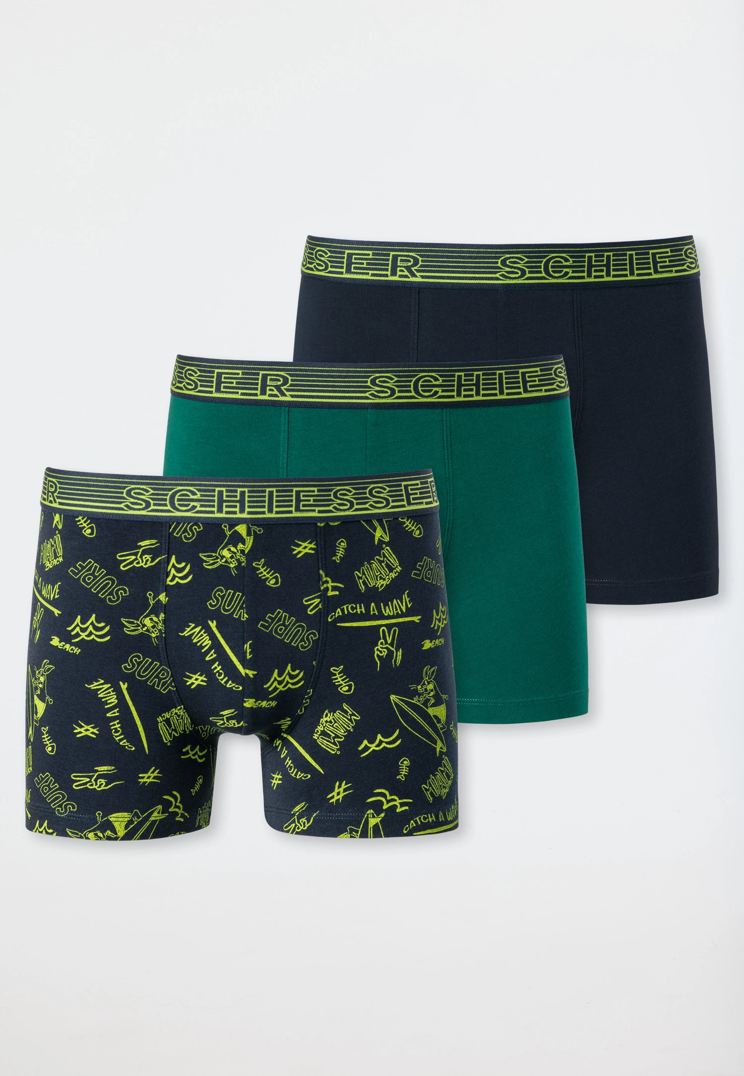 These boys’ boxer briefs in a practical three-pack are perfect for cool boys who love a trendy look. In addition to two pairs of solid-color pants in dark blue and dark green, the multipack also satisfies with a pair in a patterned style. Summery surfer motifs in bright green round off the dark blue design. The stretchy single jersey made from organic cotton and the striped, woven elastic waistband with a logo ensure a perfect fit. A strong trio in the best SCHIESSER quality!