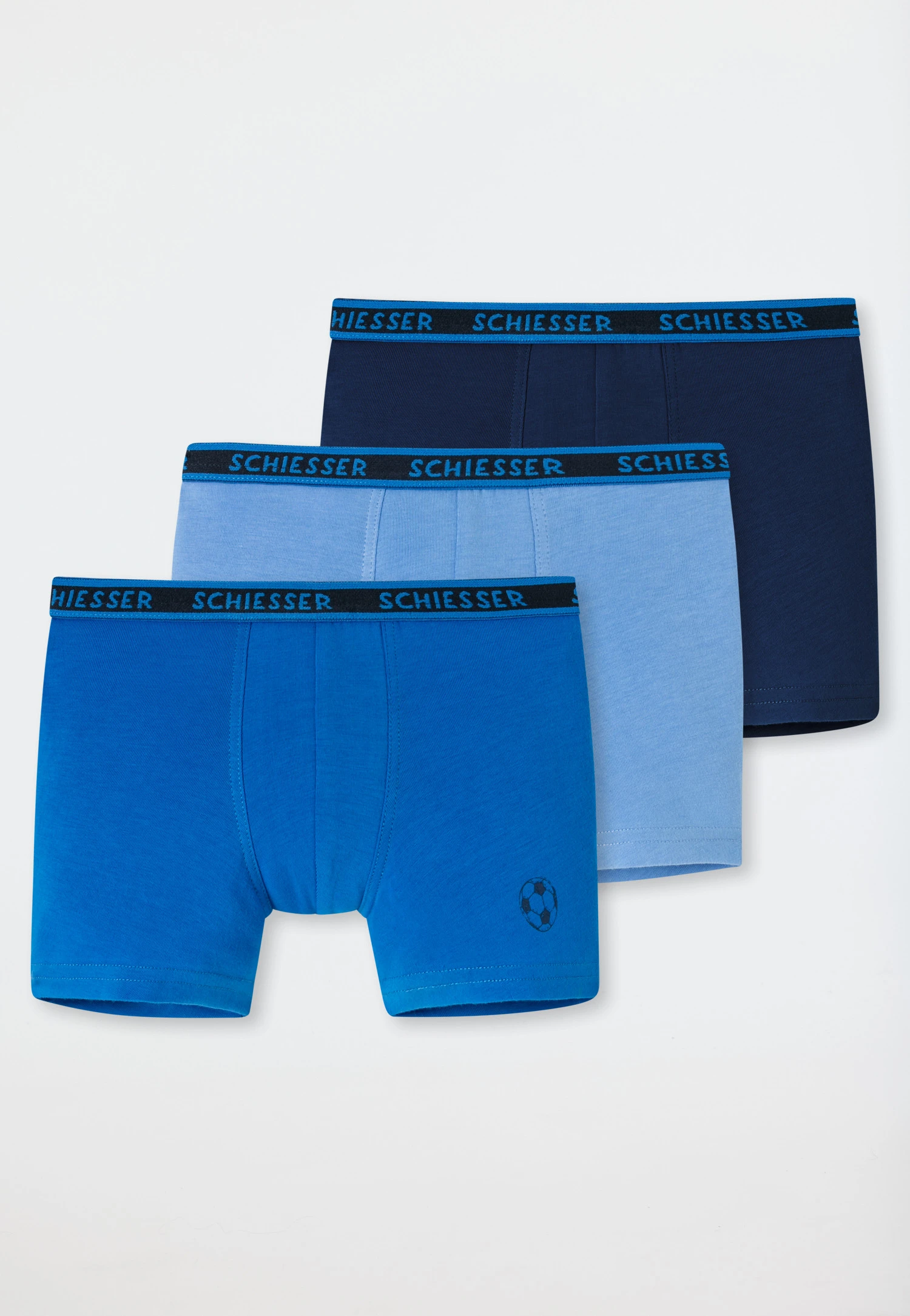 These casual boys’ boxer briefs in a practical 3-pack will be met with great delight! Whether in shades of solid blue or with a cool soccer ball motif on the leg this multi-pack is just right for our soccer players. The single jersey made of sustainable organic cotton and the comfortable woven elastic waistband provide a perfect fit and high wearing comfort when playing and romping best SCHIESSER quality all around!