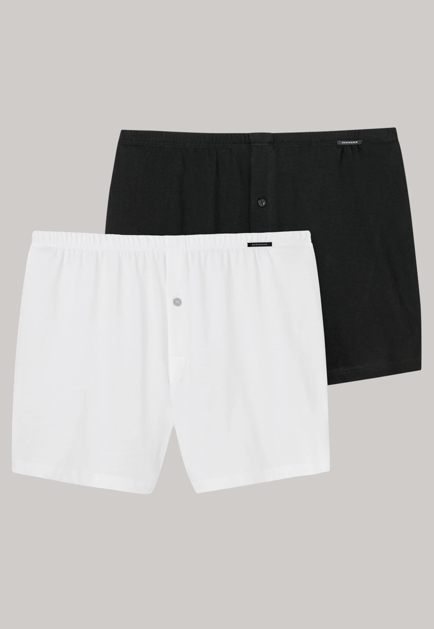 A casual look meets fine single jersey made of 100% cotton with these two men’s boxer shorts. The button placket with one visible button adds a functional detail, while the elastic multi-needle waistband ensures maximum comfort and dimensional stability throughout the day. A masculine underwear double pack in black and white – in the best SCHIESSER quality, of course!