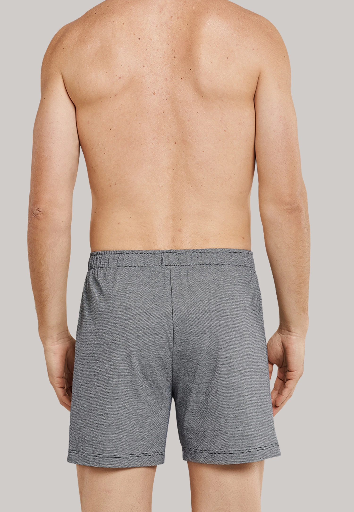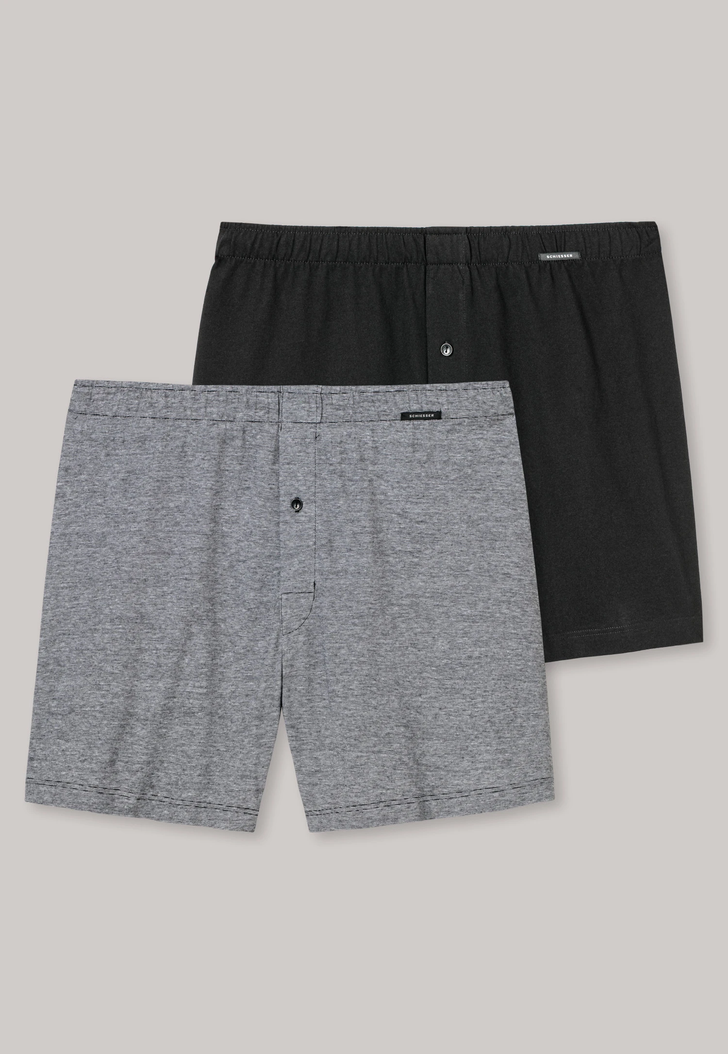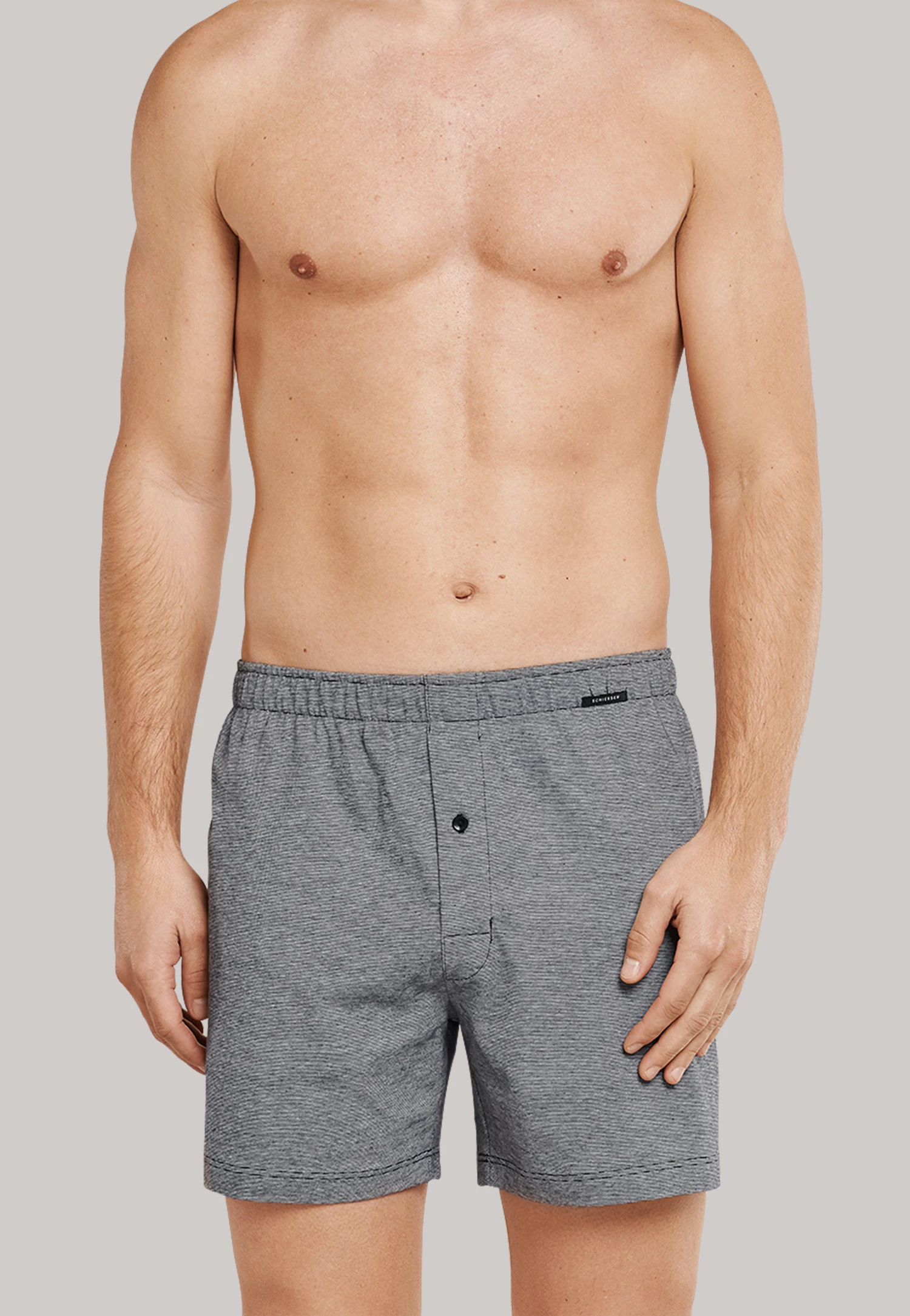 These two boxer shorts for men feature a casual look in fine single jersey made of 100% cotton. Classic black and white shades appear in one model with subtle stripes, the second in the solid black version. The button placket with visible button adds a functional detail, the elastic multi-needle waistband ensures maximum comfort and retains its shape throughout the day. A masculine and modern underwear double pack in the best SCHIESSER quality!