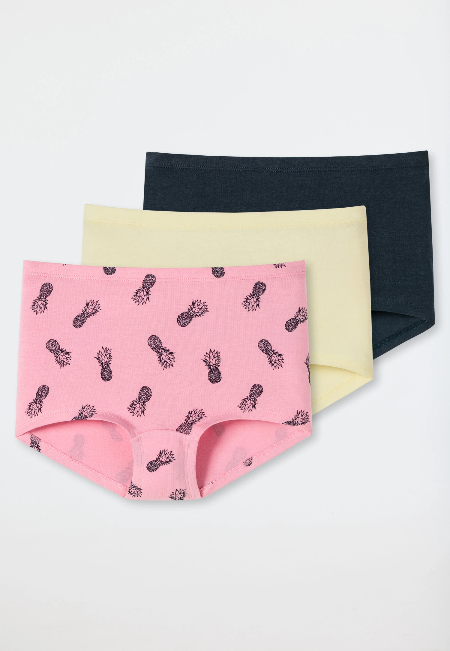 These girls’ pretty boyshorts in a practical three-pack ensure a really good mood! Whether it’s the pair in pink with fruity pineapple motifs or the solid-color designs in dark blue and yellow – this multipack is just the thing for trendy summer girls. The material made of stretchy single jersey with organic cotton and the comfortable waistband ensure a perfect fit and plenty of comfort. Stylish daywear in the best SCHIESSER quality.