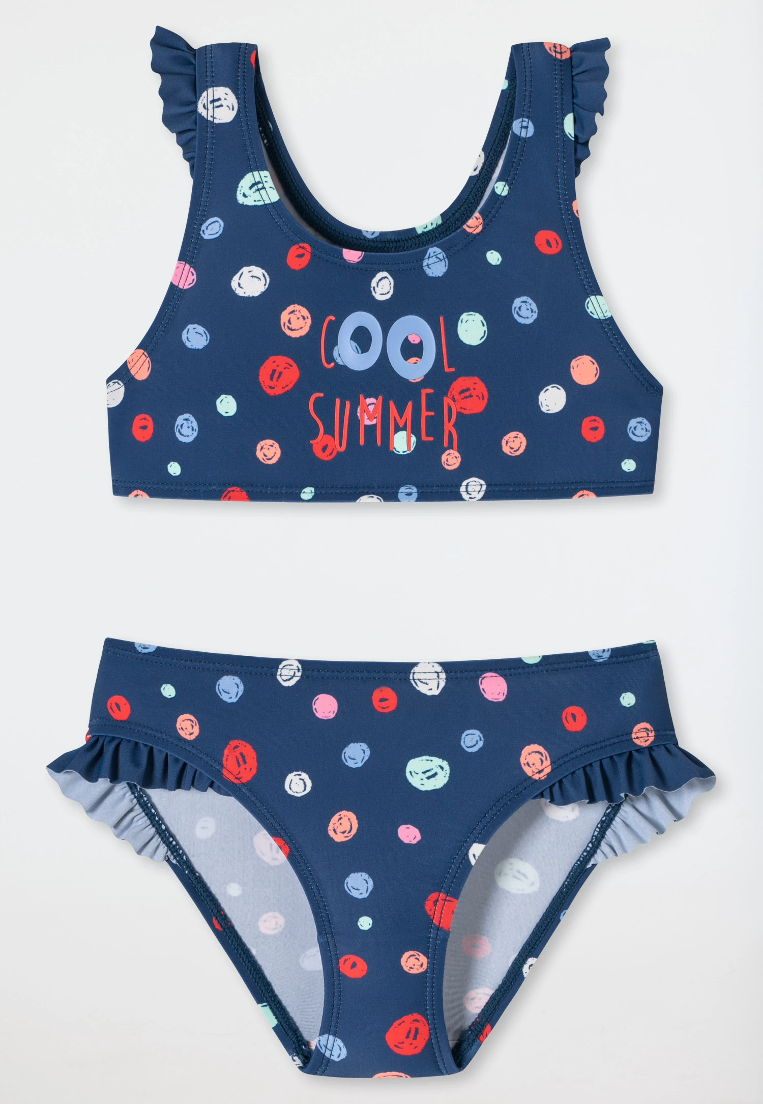 - bustier bikini for girls in dark blue with an all-over pattern of polka dots and “Cool Summer” lettering