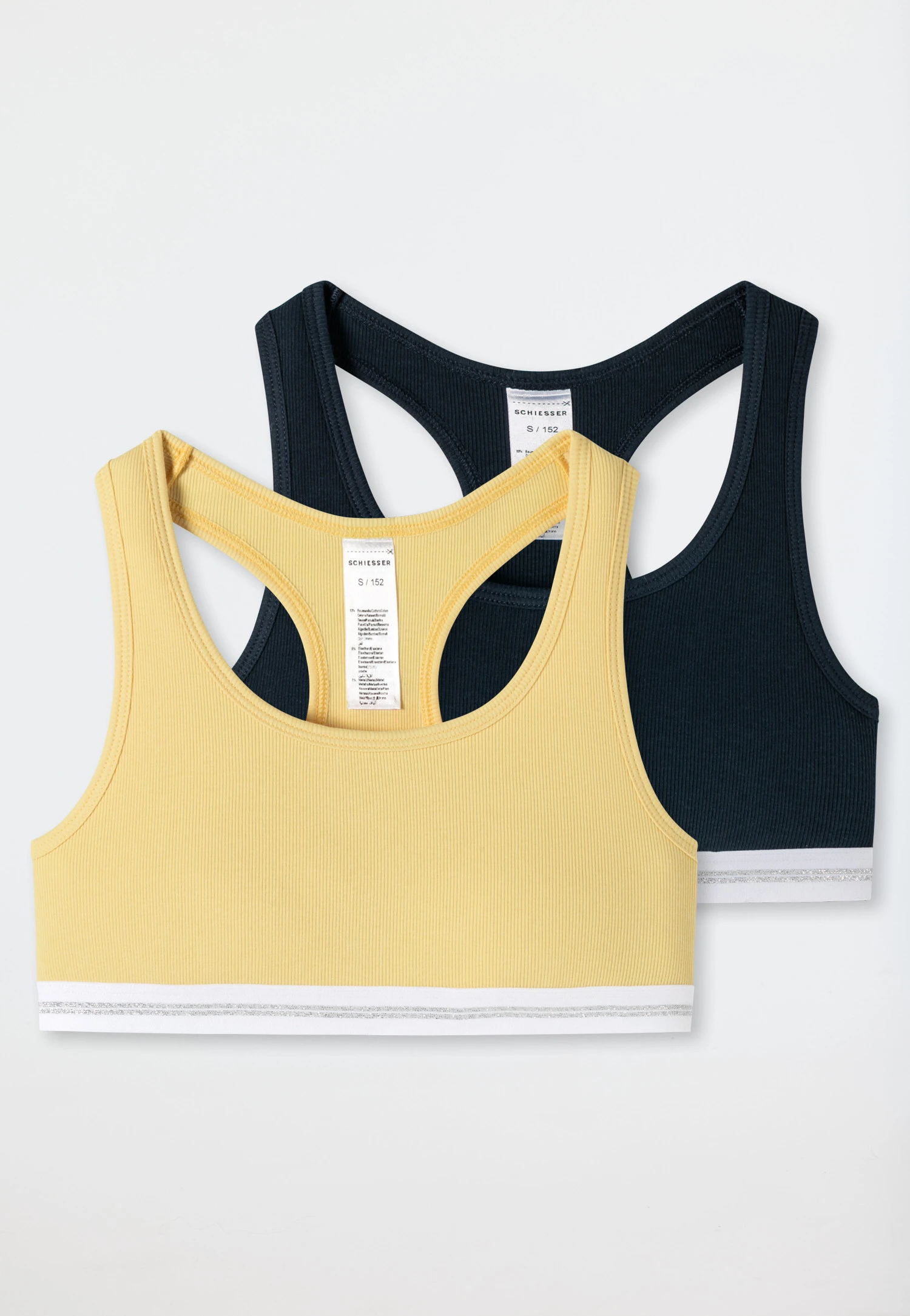 These solid-colored bustiers are perfect for girls who love adventure. The sporty look of this underwear duo is all thanks to the cool racerback and is finished off with a decorative waistband featuring shimmering Lurex contrasting stripes. But the stretchy, non-pilling double rib with a comfortable fit impresses in its own right. A sporty underwear duo in the best SCHIESSER quality.