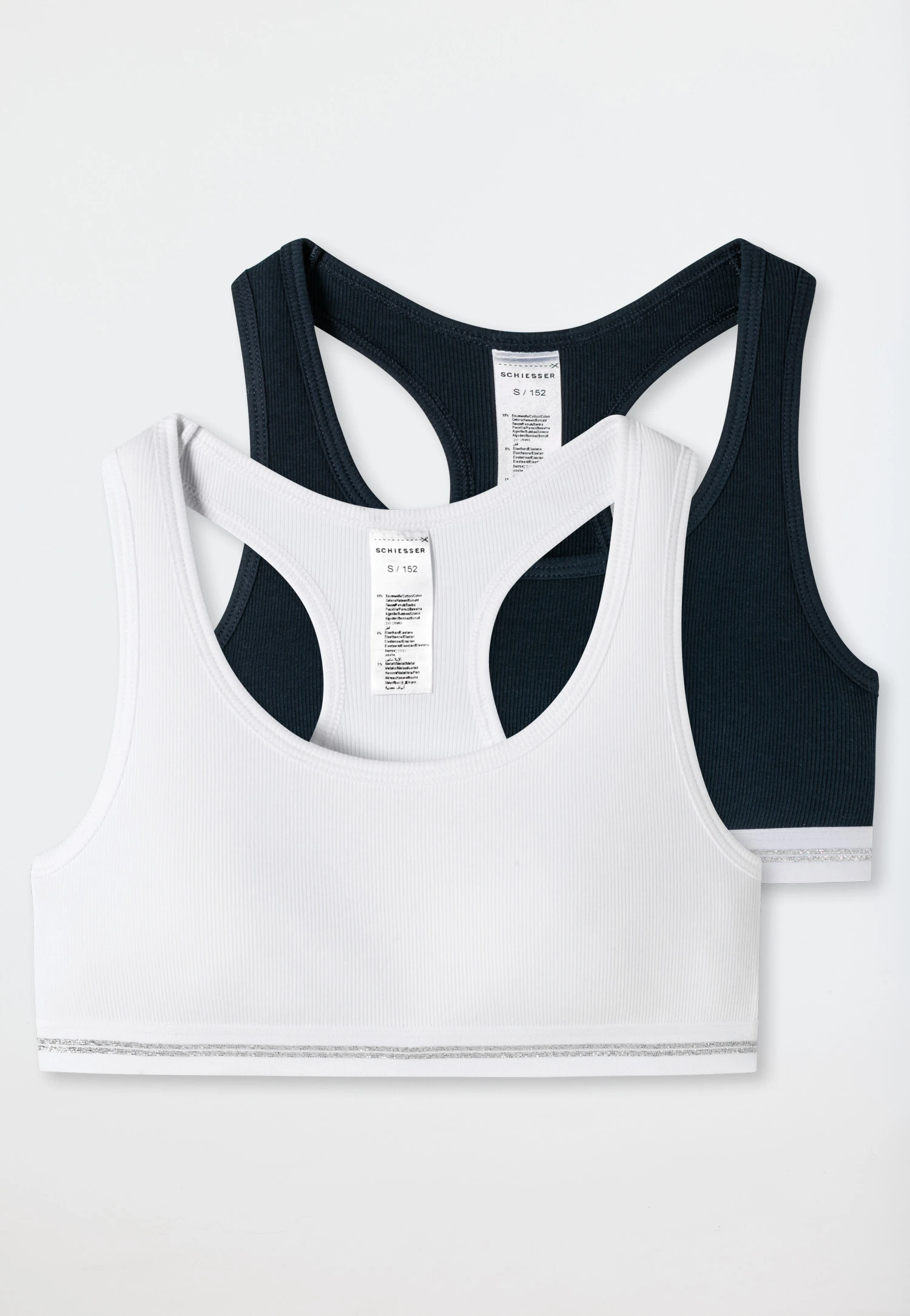 These solid-colored bustiers are perfect for girls who love adventure. The sporty look of this underwear duo is all thanks to the cool racerback and is finished off with a decorative waistband featuring shimmering Lurex contrasting stripes. But the stretchy, non-pilling double rib with a comfortable fit impresses in its own right. A sporty underwear duo in the best SCHIESSER quality.