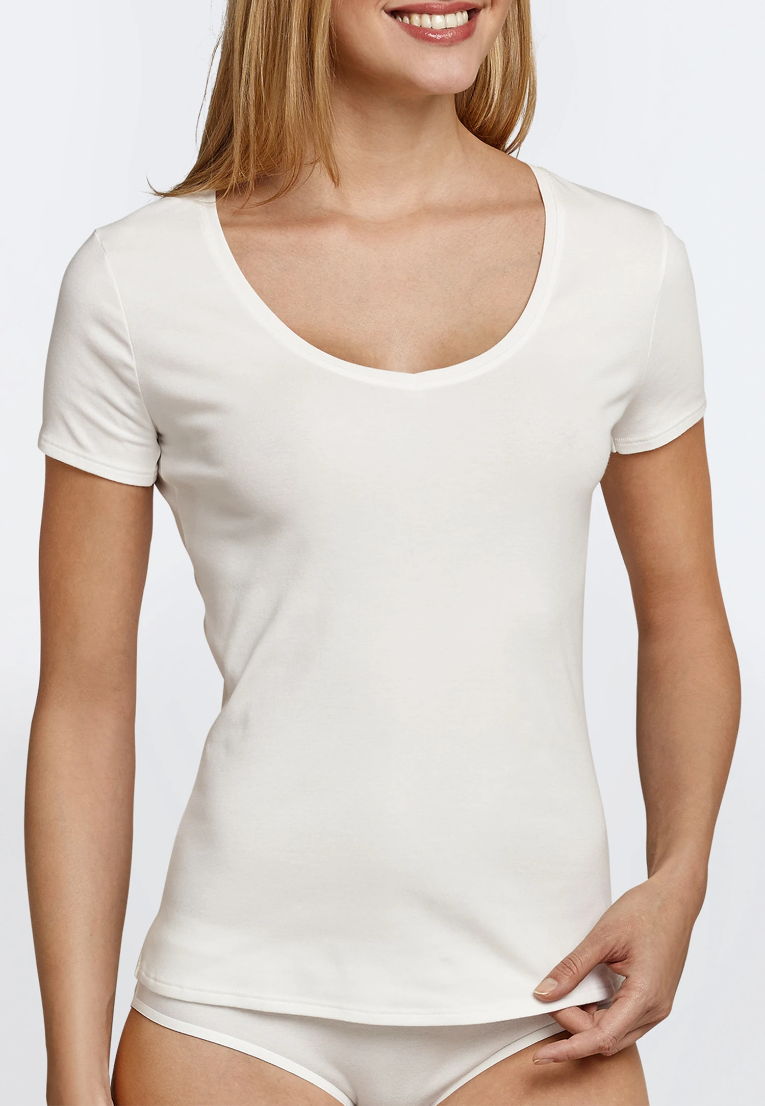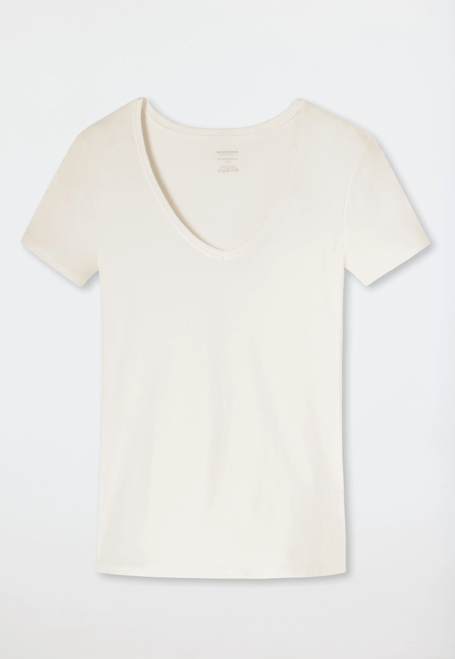 This cream-white women’s t-shirt from the SCHIESSER line “Naturschönheit” ensnares with an amazingly soft material and a pure design. The discreet V neckline and a fine SCHIESSER labeling on the back are already everything that the short-sleeved shirt needs in order to wrap its wearer around the finger. Since in soft, elastic fine rib, any accessories become secondary and only one thing will be important: The natural beauty in best SCHIESSER quality!
