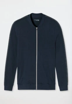 You can relax to your heart’s content in this men’s dark blue jacket in a sporty design. The casual cut and small stand-up collar make the sweat jacket a fashionable everyday companion. The ribbed cuffs on the sleeves and hem as well as the side pockets act as cool details. Stretchy sweatwear made of organic cotton and soft Tencel ensures a comfortable fit. The natural fibers are breathable and temperature-regulating. Best SCHIESSER quality!