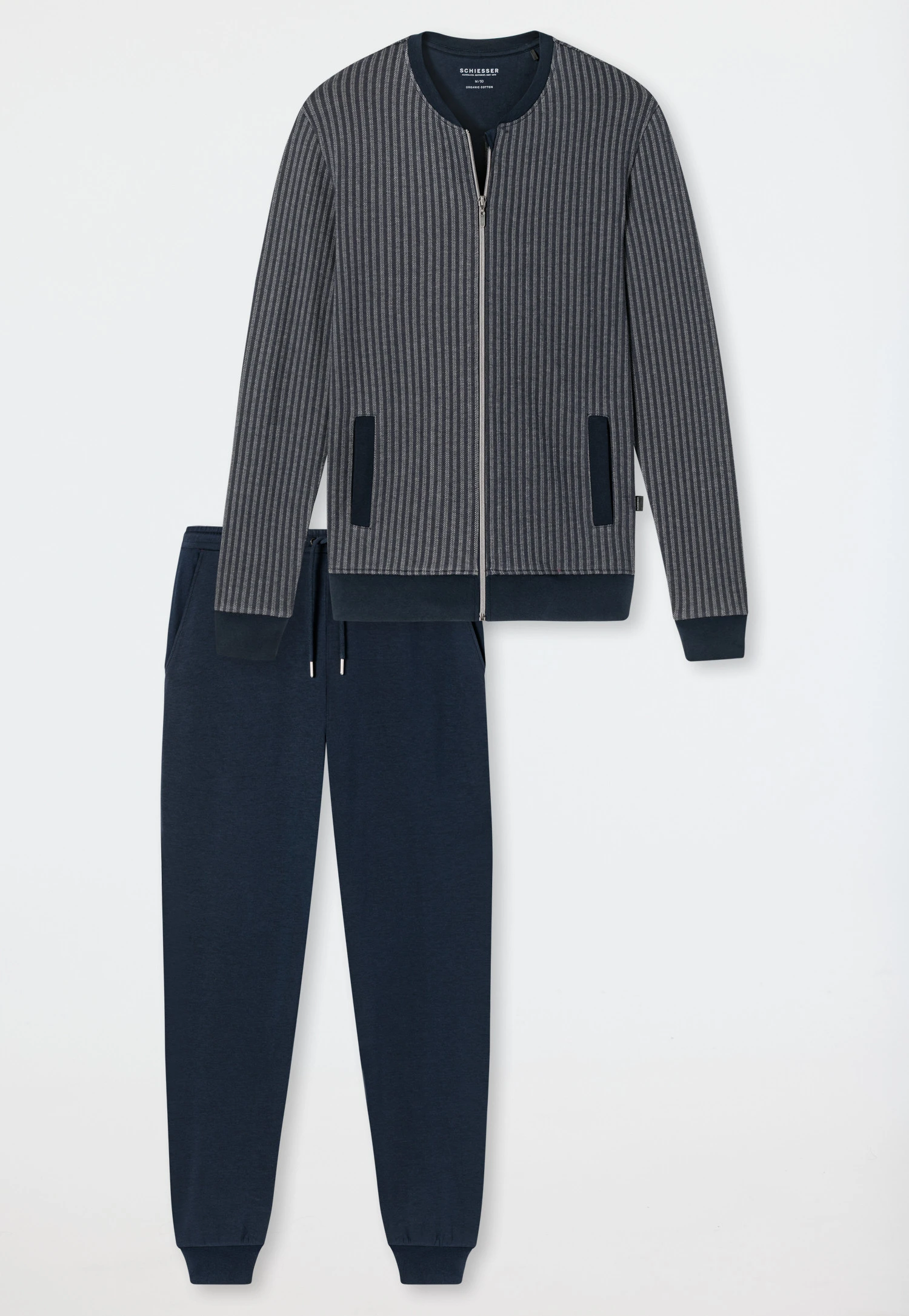 Relax in style: this leisure suit for men is made for exactly that! Stretchy sweat fabric with soft Tencel makes lounge fashion the perfect feel-good partner. The zip-up jacket is an eye-catcher thanks to the herringbone pattern. It features additional stylish details in the form of the stand-up collar, pockets, hem and cuffs in dark blue. The dark blue cuffed pants with drawstring and decorative seam round off the leisure suit – in the best SCHIESSER quality, of course!