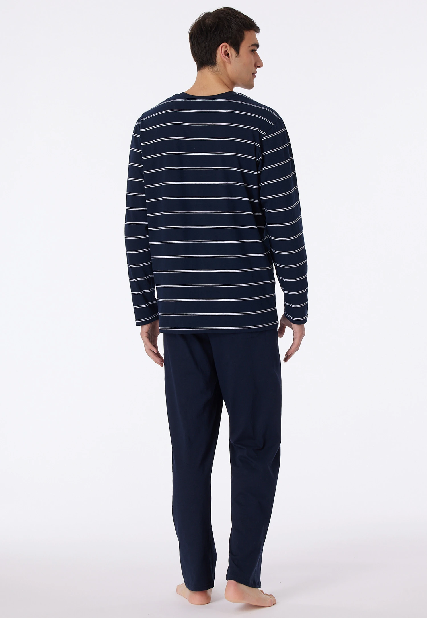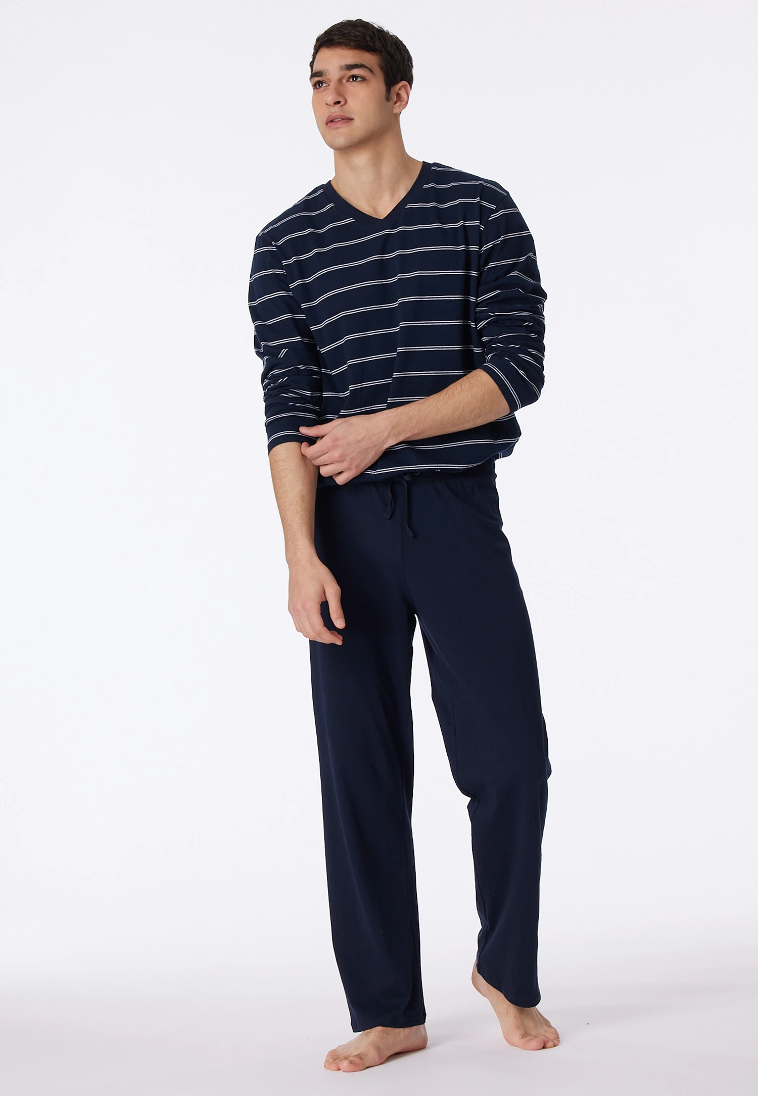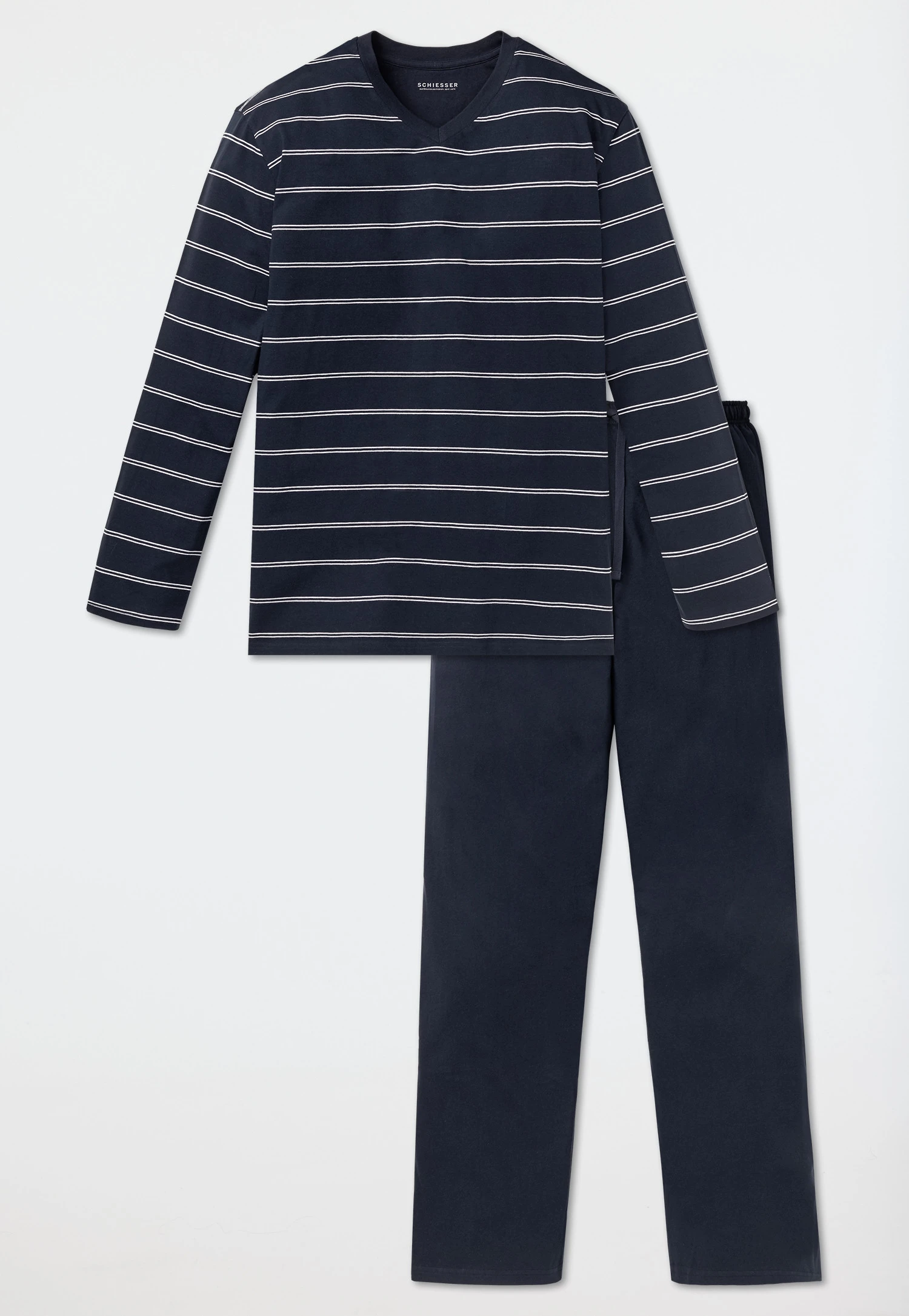 These long, dark blue men’s pajamas guarantee pleasant nights with their 100% soft cotton. White knitted stripes and dark blue accented V-neck give this top a sporty look, which is perfectly complemented by the long, dark blue pants with drawstring at the waistband and back pocket. Simple, comfortable pajamas in the best SCHIESSER quality – also available in special sizes!