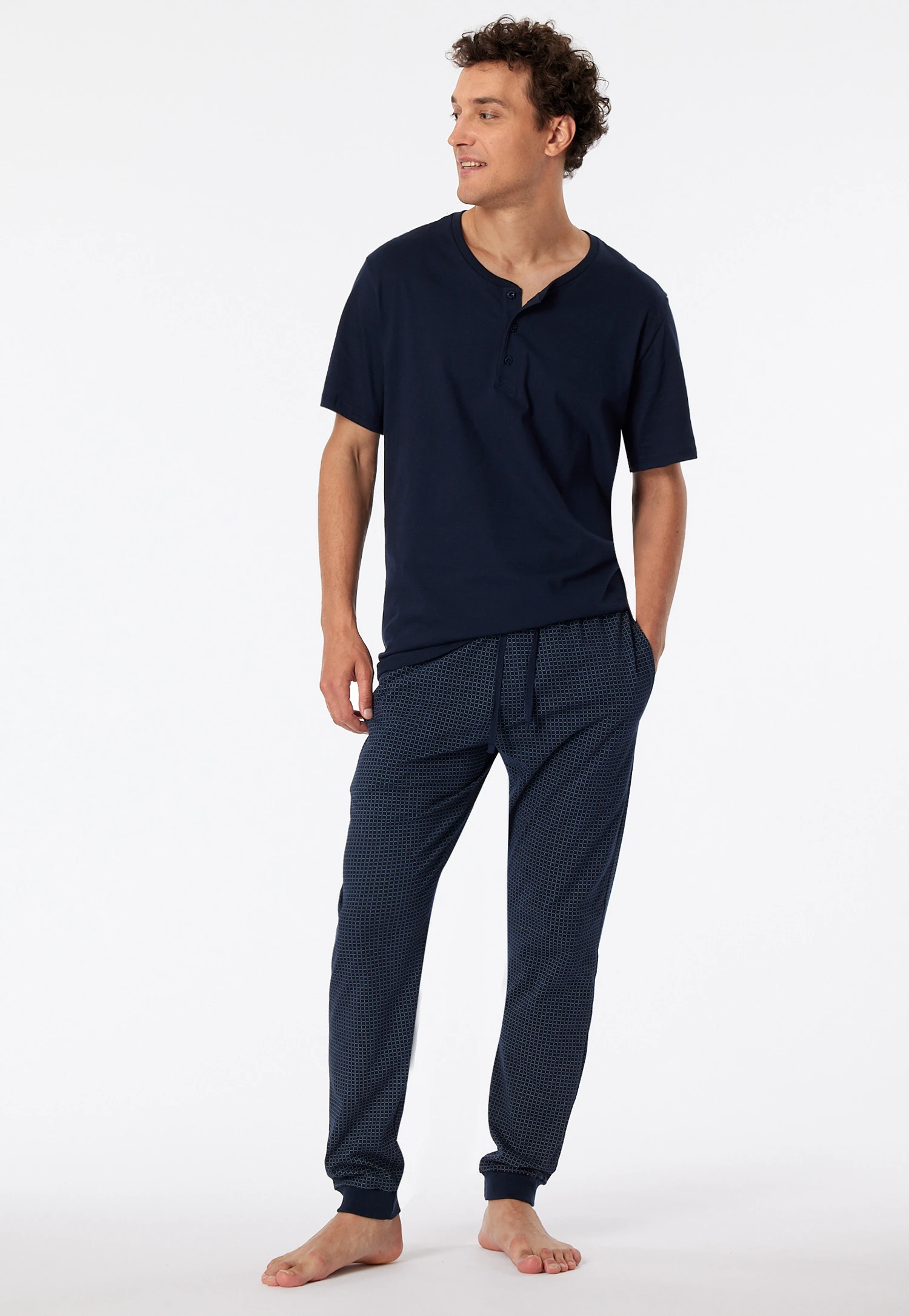 Whether it’s relaxing or sleeping, these dark blue and light blue checkered men’s pants are always the right choice! These loose jogging pants from the popular “Mix & Relax” line win you over with their soft jersey material made of 100% cotton and are equipped with side pockets and a functional button placket. The dark gray drawstring in the elastic waistband and the cuffed pant legs are other practical details. A comfortable basic in the best SCHIESSER quality!