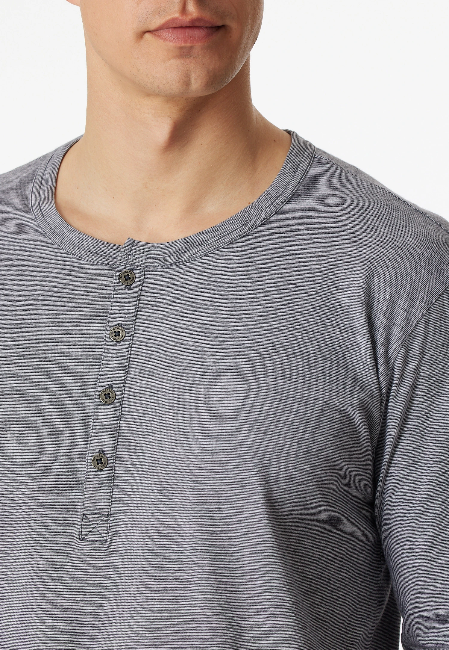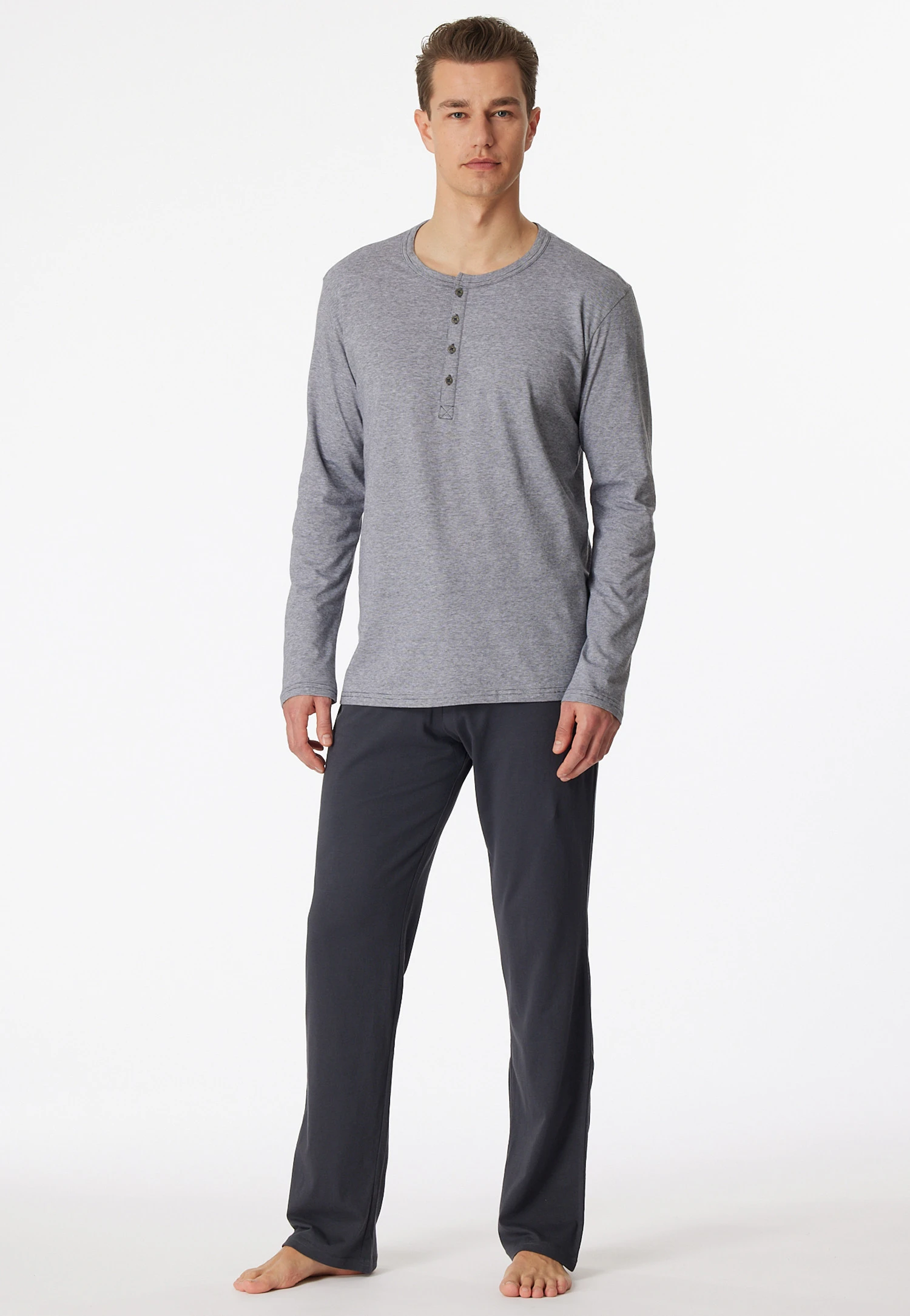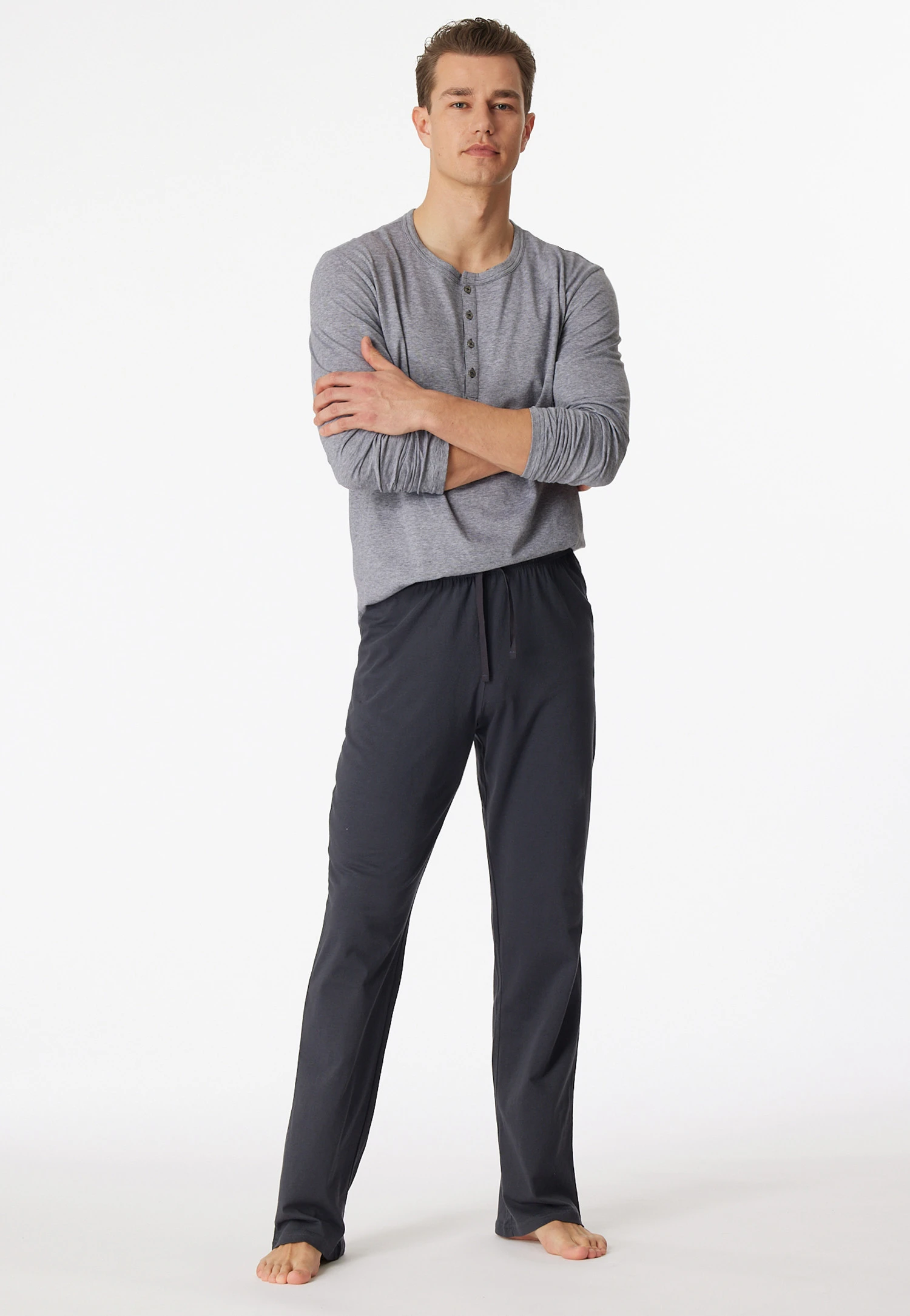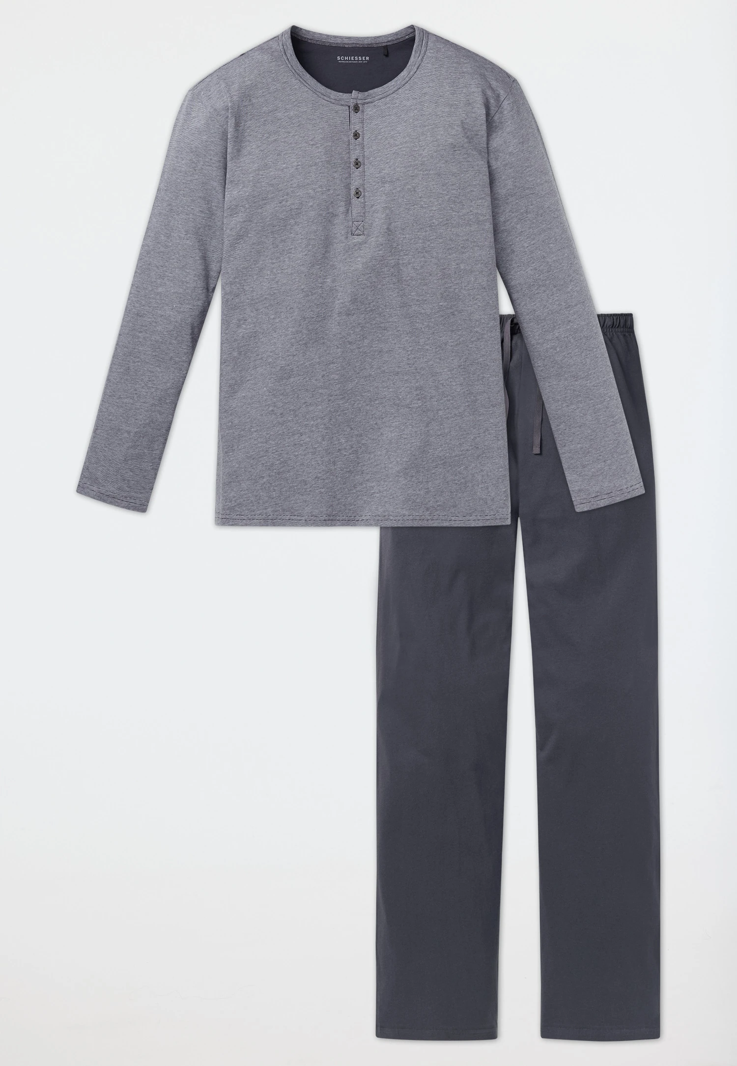 With its sporty look and 100% soft cotton, these long pajamas win over discerning men. A serafino collar with button placket give the top with its fine gray and white strips a discreet detail, further complemented by the long gray pants. Lightweight single jersey takes care of the comfortable part and makes this set particularly comfortable. Just the thing for men who prefer spending relaxing nights in the best SCHIESSER quality!