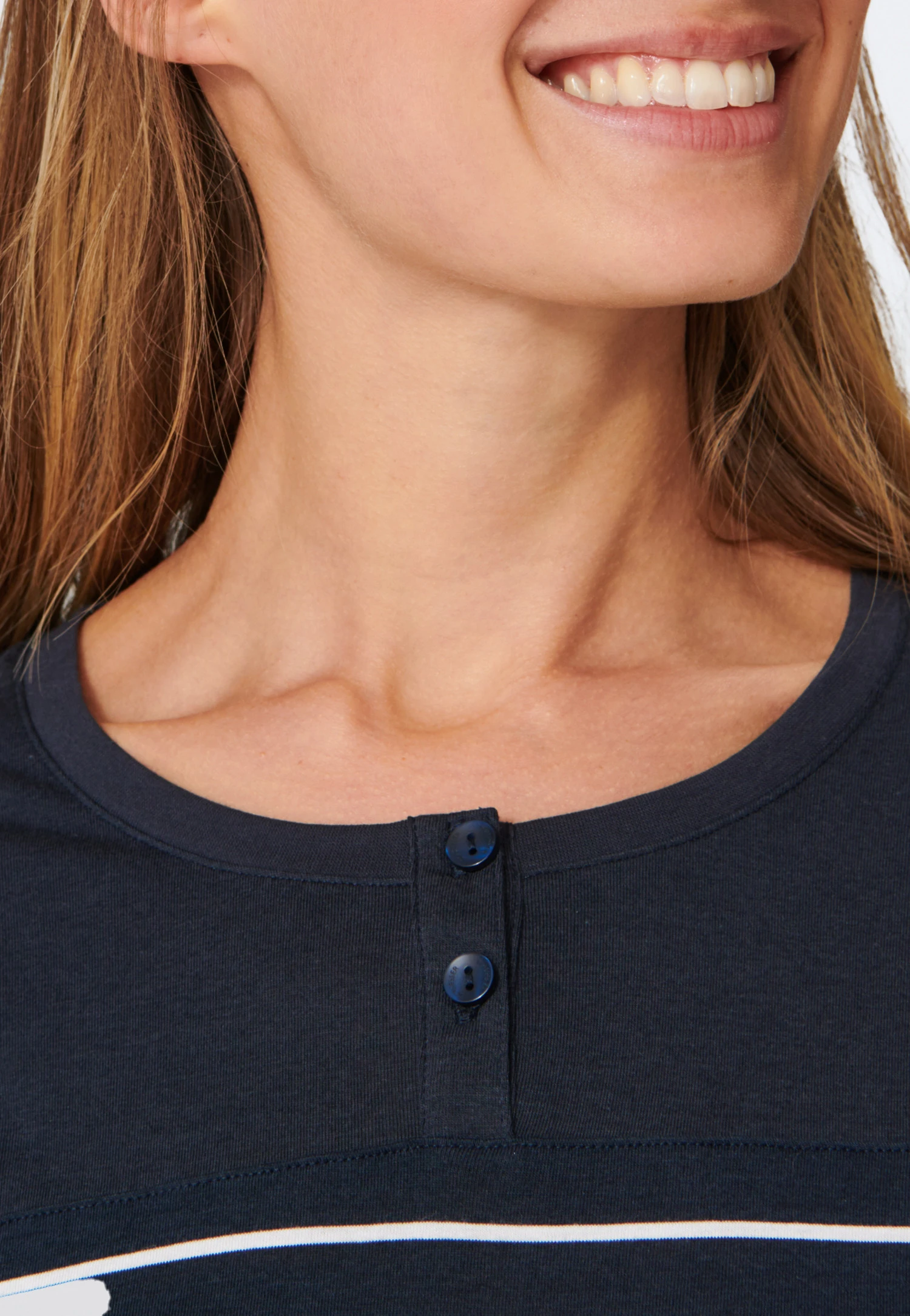 - rounder, wider collar with midnight blue edging and short button placket with 2 buttons