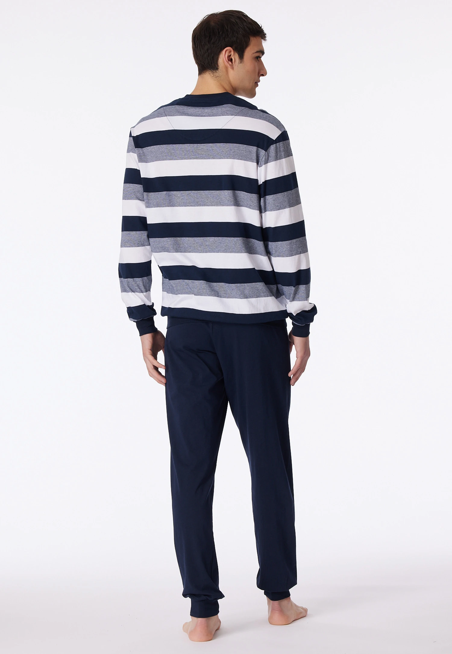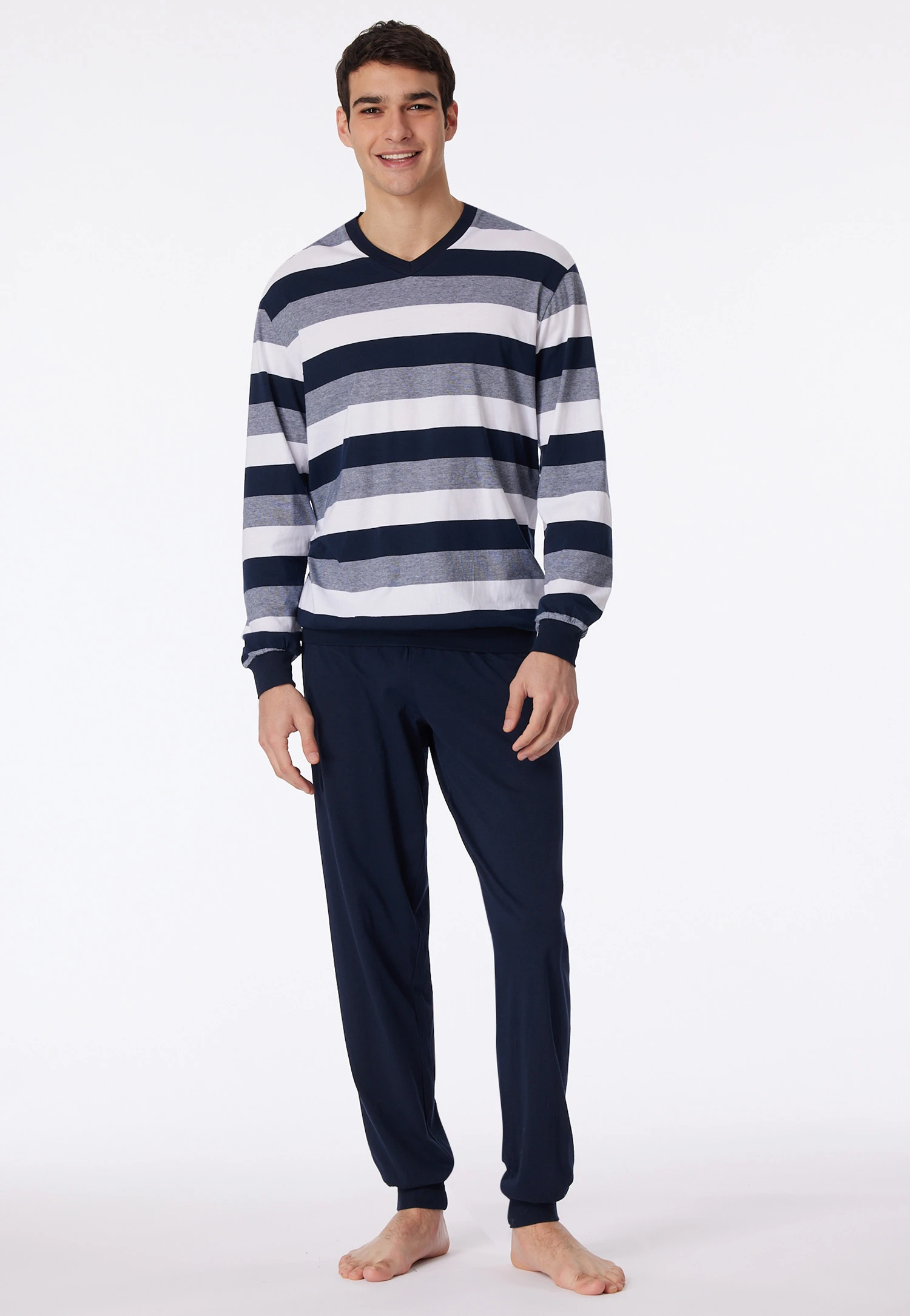 Maximum comfort meets a sporty look with these long men’s pajamas With their dark blue and white square rings, the top is a fresh eye-catcher, which features subtle detailing thanks to the dark blue contrasting V-neck. The long, solid-colored dark blue pants complement the duo perfectly and, along with the shirt, features comfortable, dark blue cuffs. Masculine, comfortable pajamas in the best SCHIESSER quality – also available in special sizes!