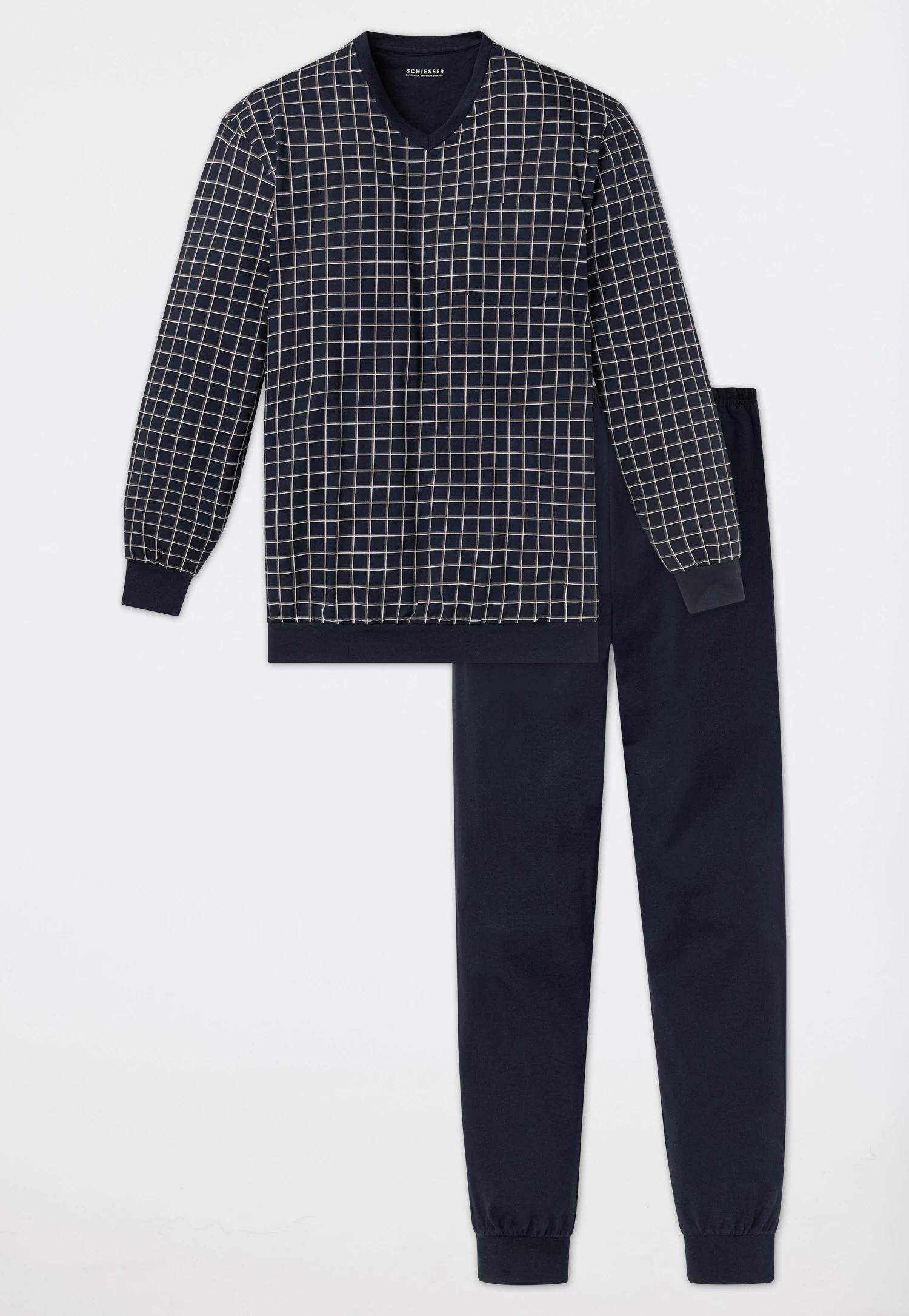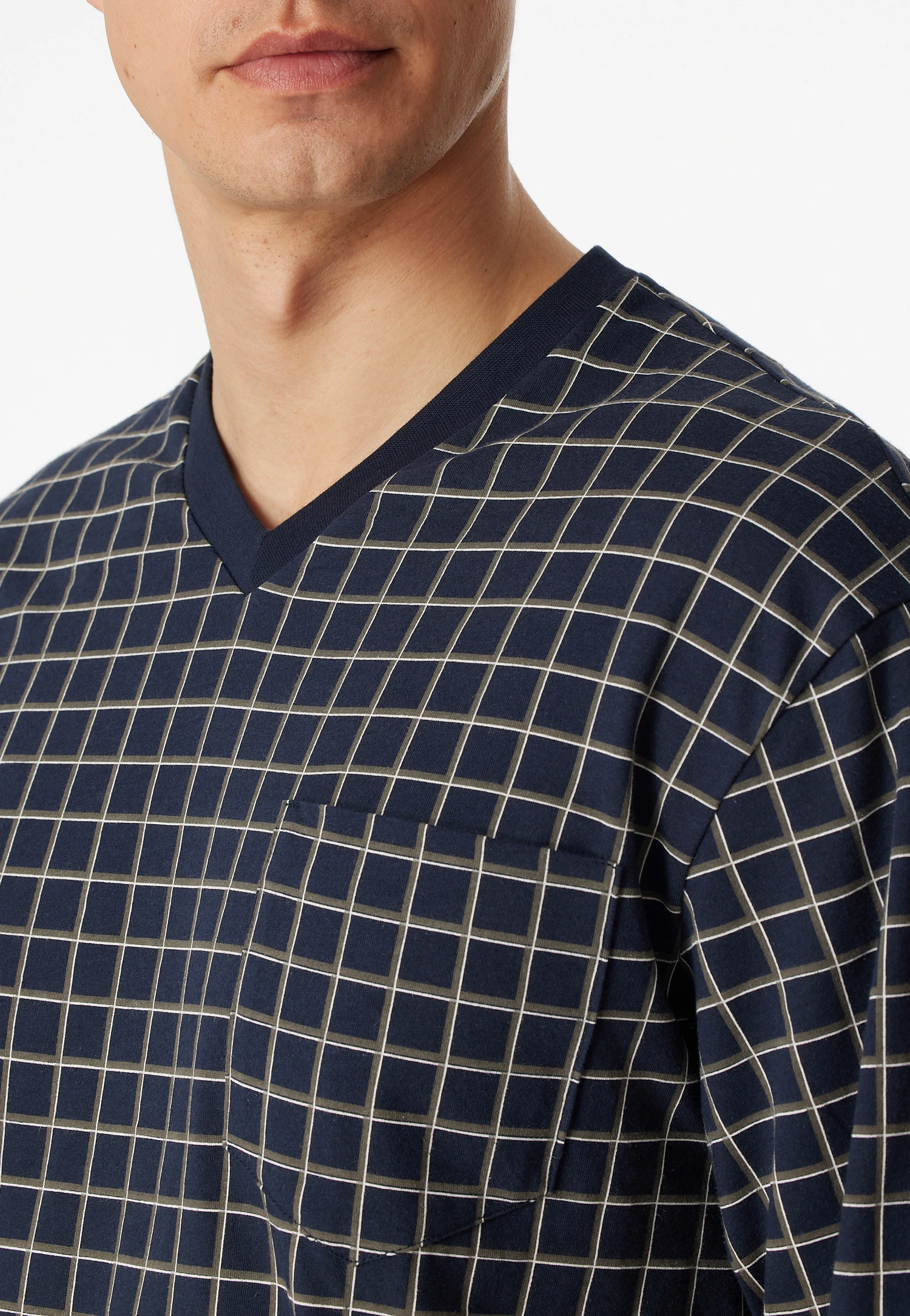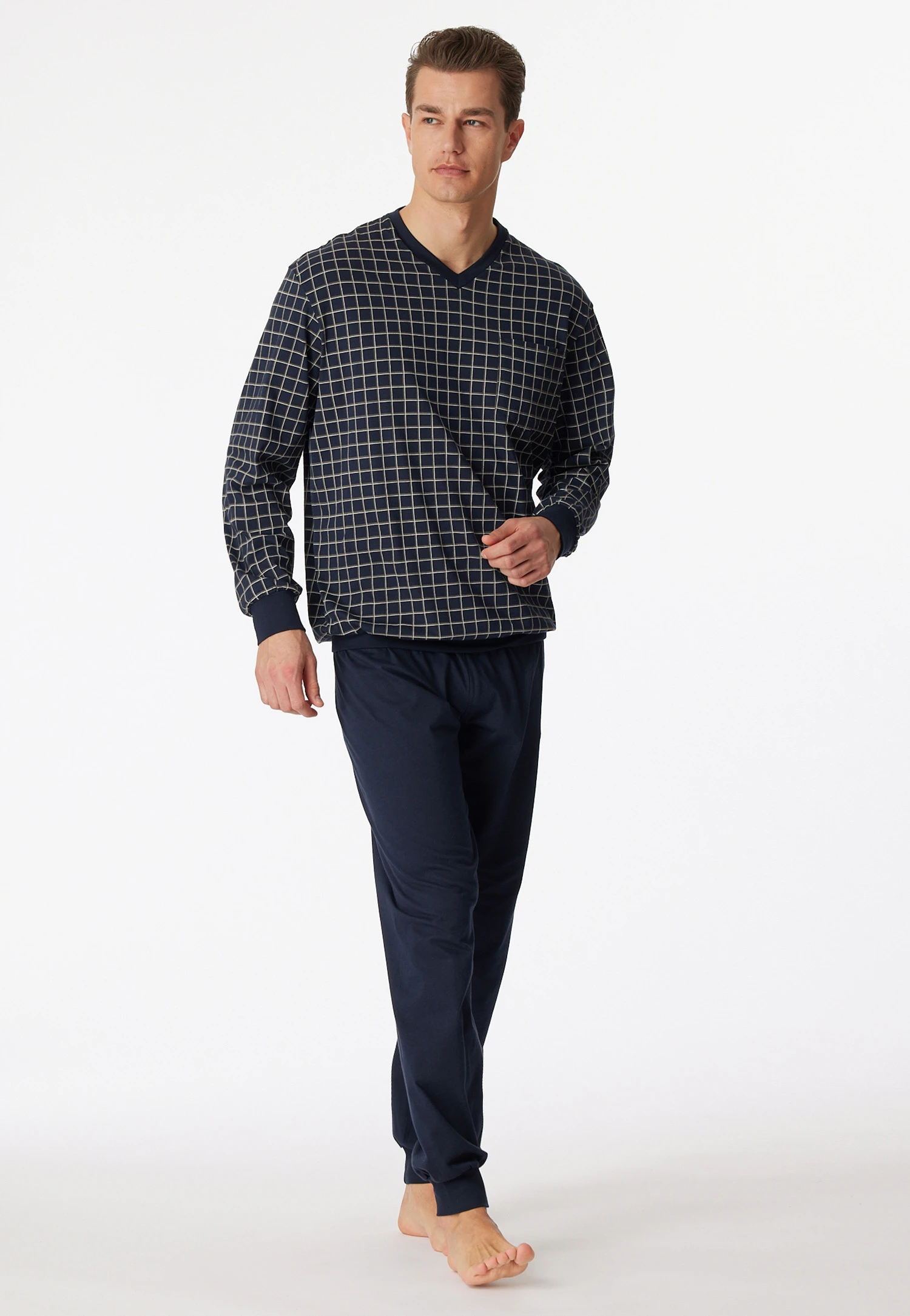 Maximum comfort is the focus with these long, dark blue pajamas for men. Fine jersey from 100% cotton feels incredibly soft and is nicely finished off with cuffed sleeves and pant legs. The pair can also score points visually: the white and blue checkered pattern gives the top a masculine character and features a patch pocket on the chest as a fine detail. Perfect for men who don’t want to forego the best SCHIESSER quality at any time!