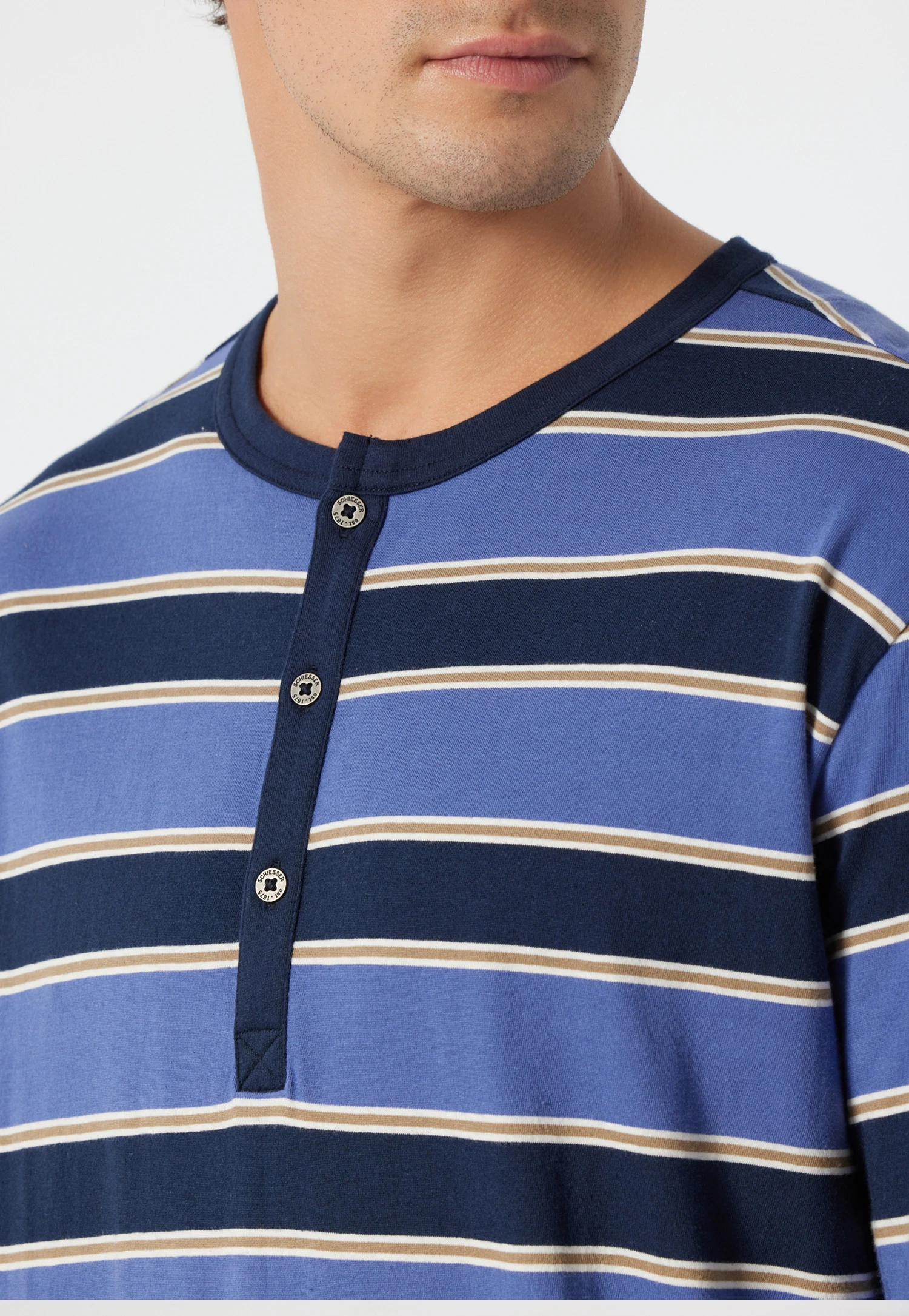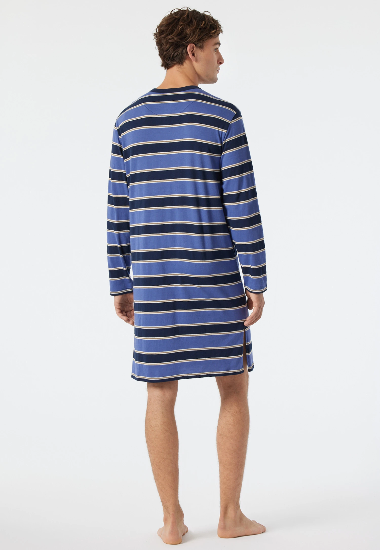 Because comfort is the top priority, this long-sleeved sleep shirt made of 100% high-quality, lightweight cotton is always the right choice. The classic, masculine striped design in expressive denim blue and dark blue makes this piece a real eye-catcher. The dark blue edged Serafino collar with stylish button placket and side slits for maximum freedom of movement are additional details that satisfy – in the best SCHIESSER quality, of course!