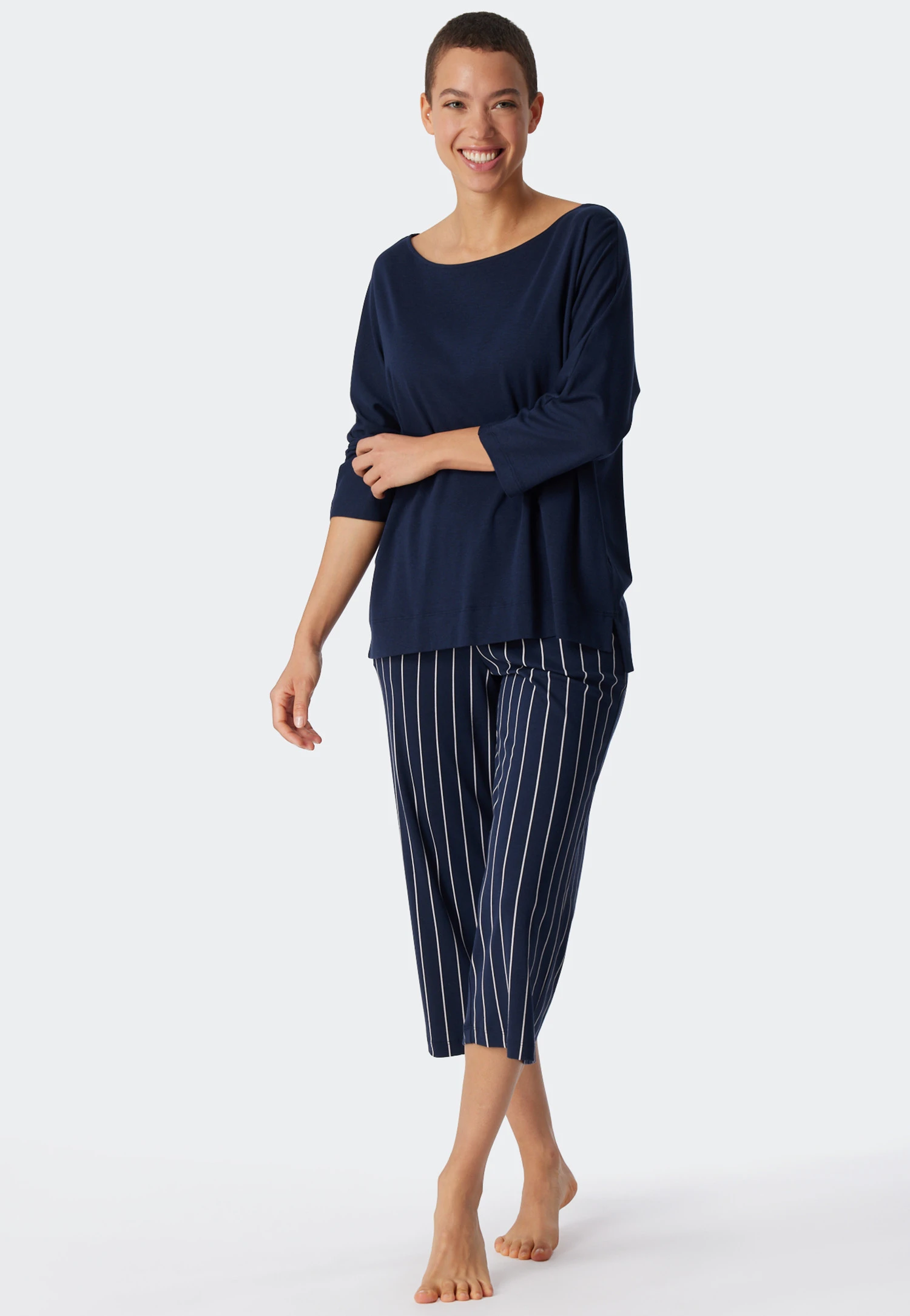 Stylish nightwear you won’t want to take off in the morning: These 3/4-length women’s pajamas impress with their casual look! The shirt is divinely comfortable with its oversized cut, batwing sleeves and slits on the side. The same is true of the striped pants that promise to be very comfortable with their wide Marlene cut, stretchy waistband and pockets on the side. The interlock fabric with cotton and natural, breathable modal feels wonderfully soft on the skin. Best SCHIESSER quality!