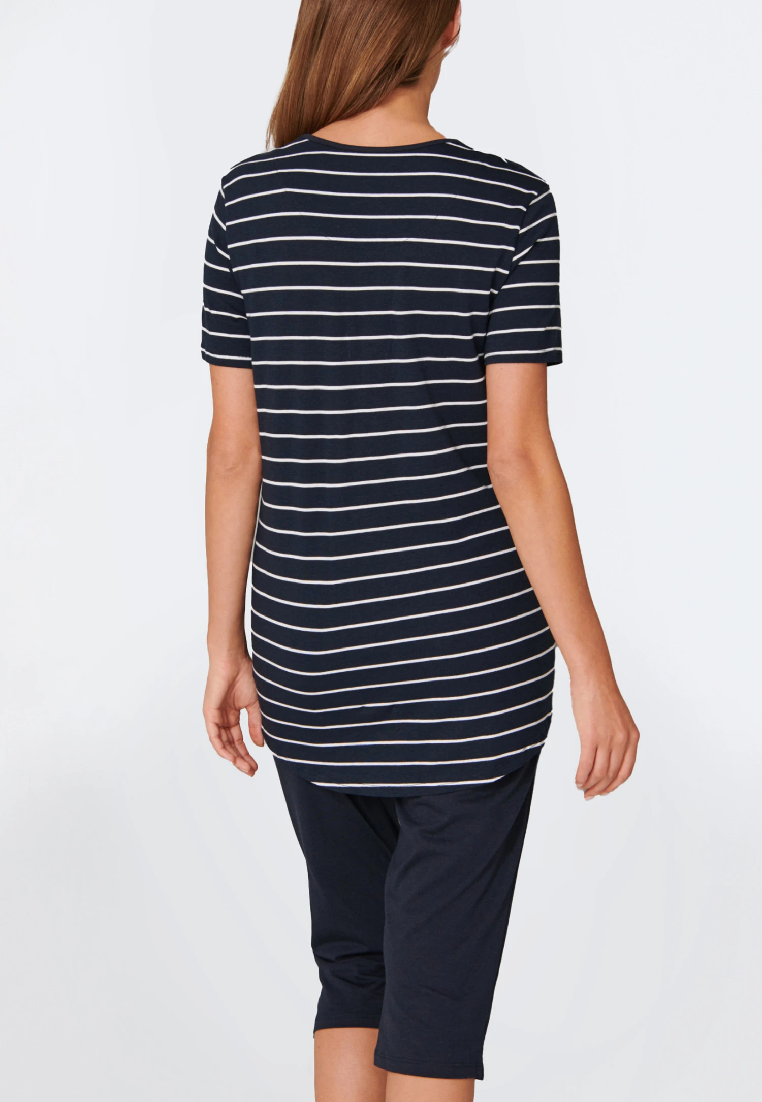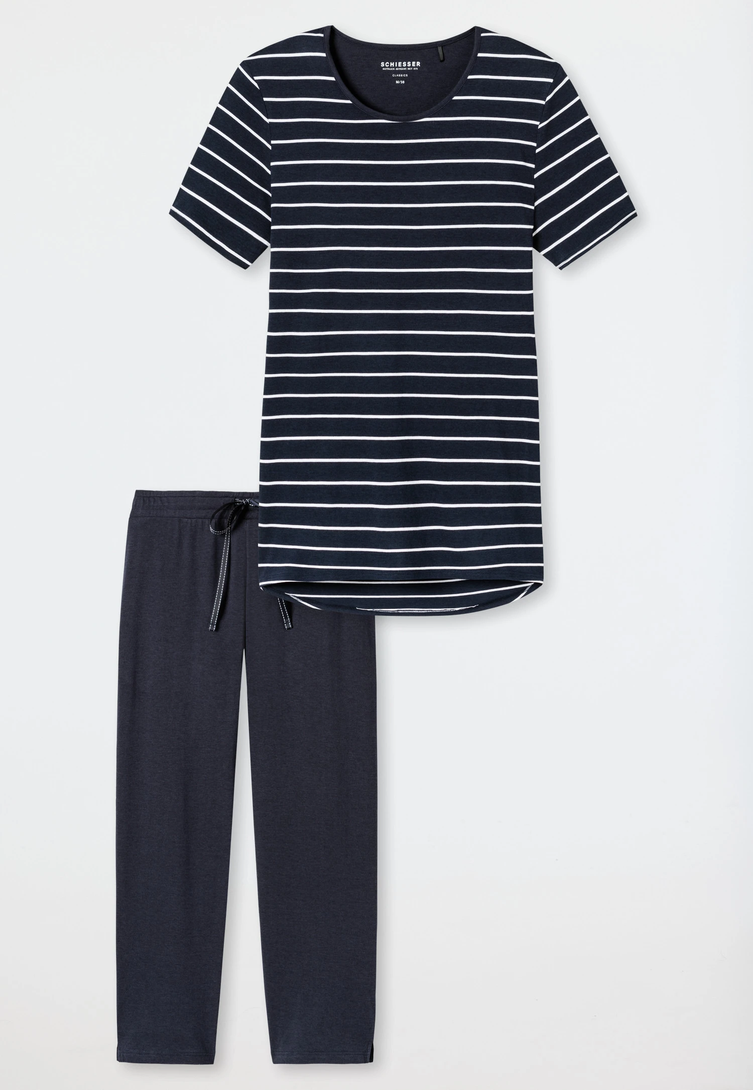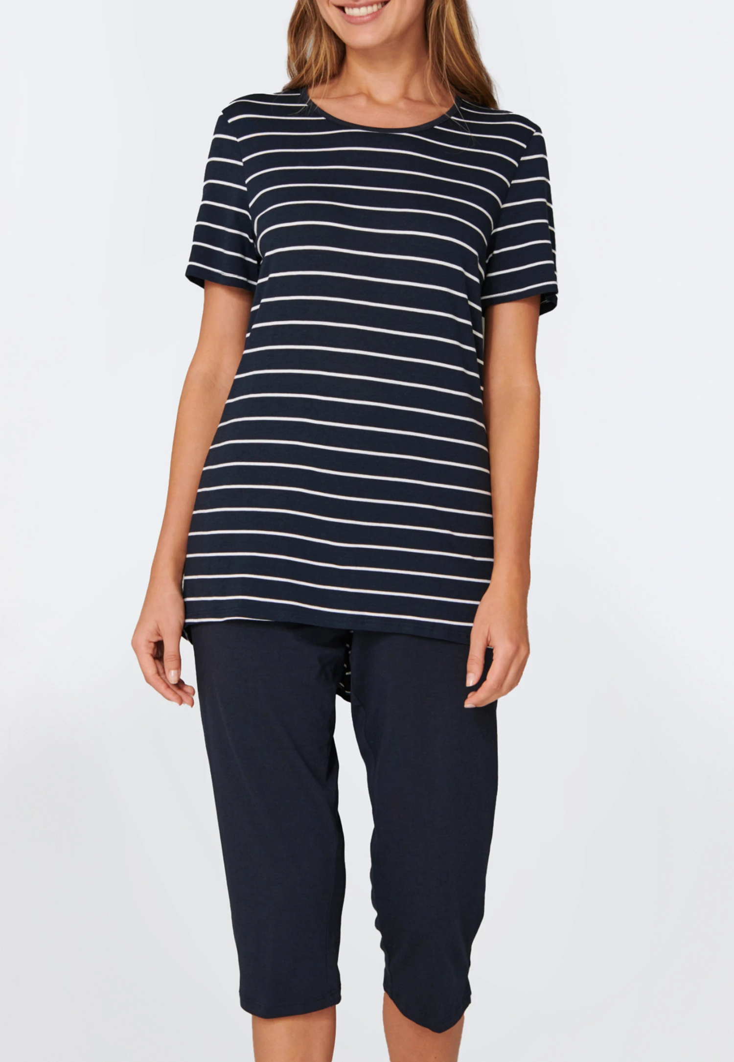 These ladies’ midnight blue pajamas are just the thing for relaxing nights! Soft single jersey T-shirt made of cotton and modal ensures maximum comfort and features a fashionable marine look courtesy of the white stripes. The midnight blue contrasting crew neck trim and the curved hem add charming details and are harmoniously accompanied by the solid-colored 3/4-length pants with white embroidered drawstring. A comfortable nightwear duo in the best SCHIESSER quality!