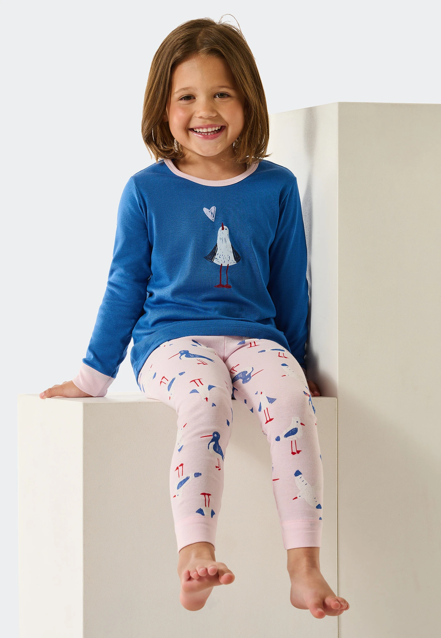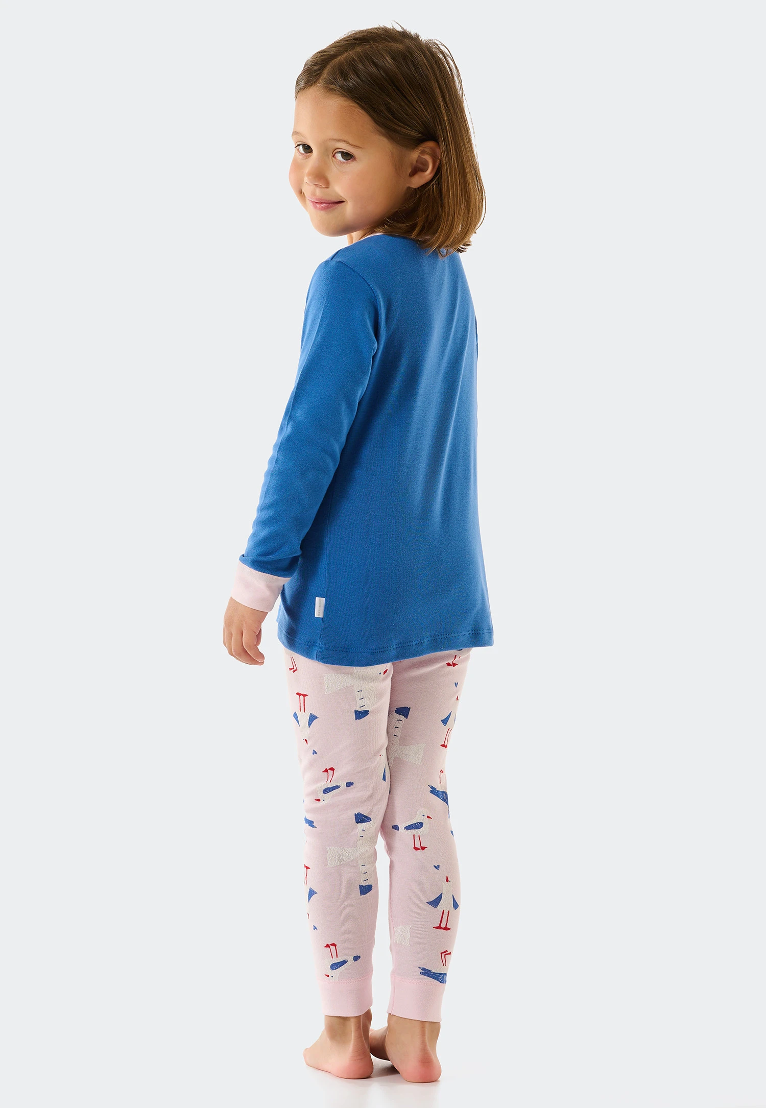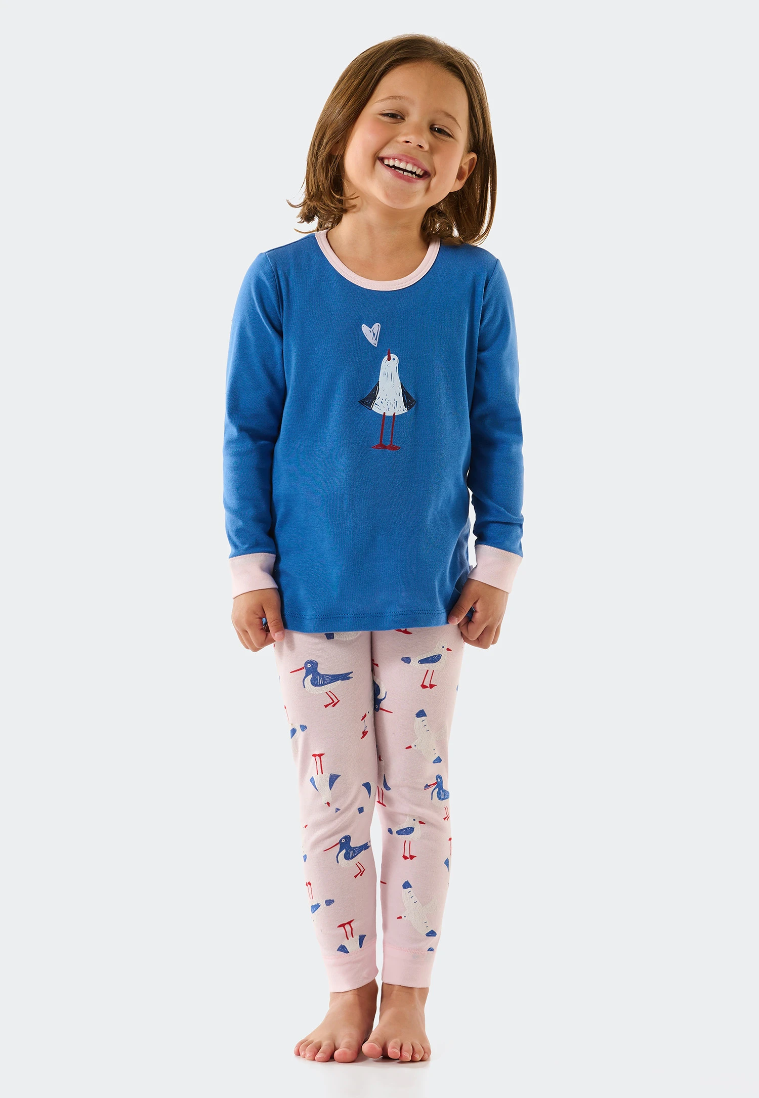 These pretty, long girls’ pajamas will really make your heart race. High-quality fine rib material made from 100% soft organic cotton feels wonderfully soft on the skin and gives your little darlings an extra portion of comfort. The seagull on the aqua-blue top is a cute eye-catcher. The rosé-color leggings satisfy with their maritime look, and the two-piece set fits perfectly during all your adventures in the land of dreams thanks to its fantastic cuffs on the arms and legs. Best SCHIESSER quality!