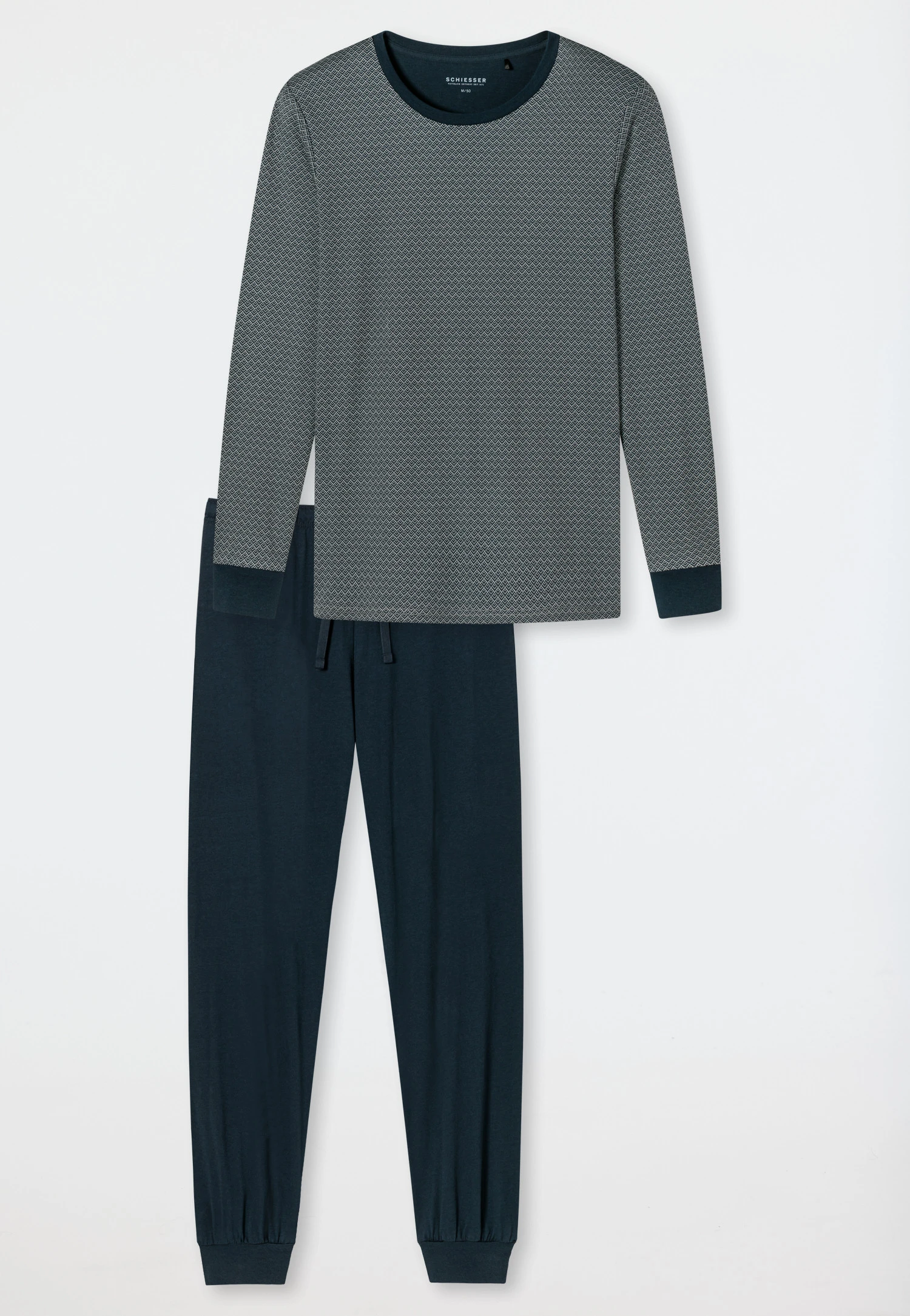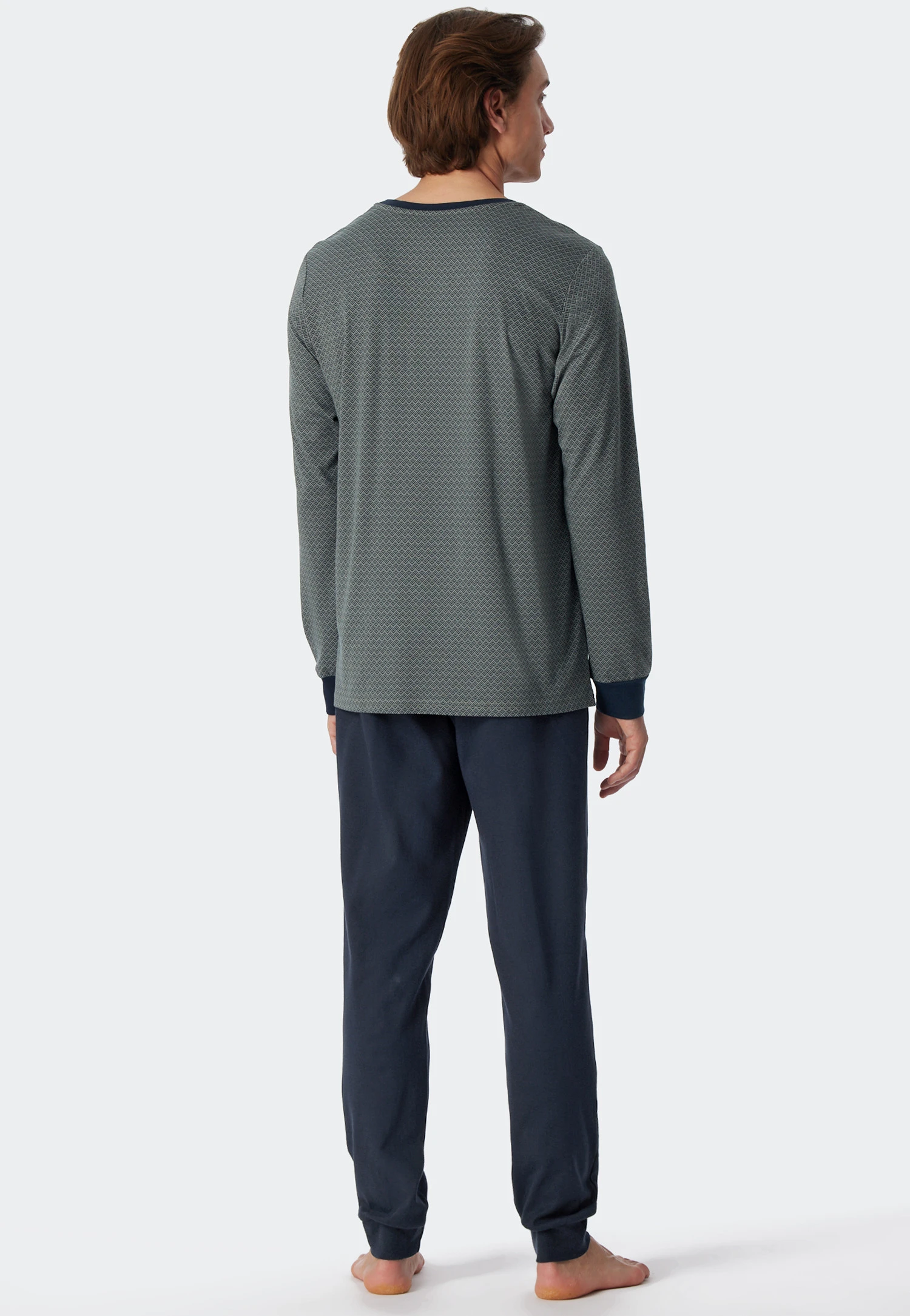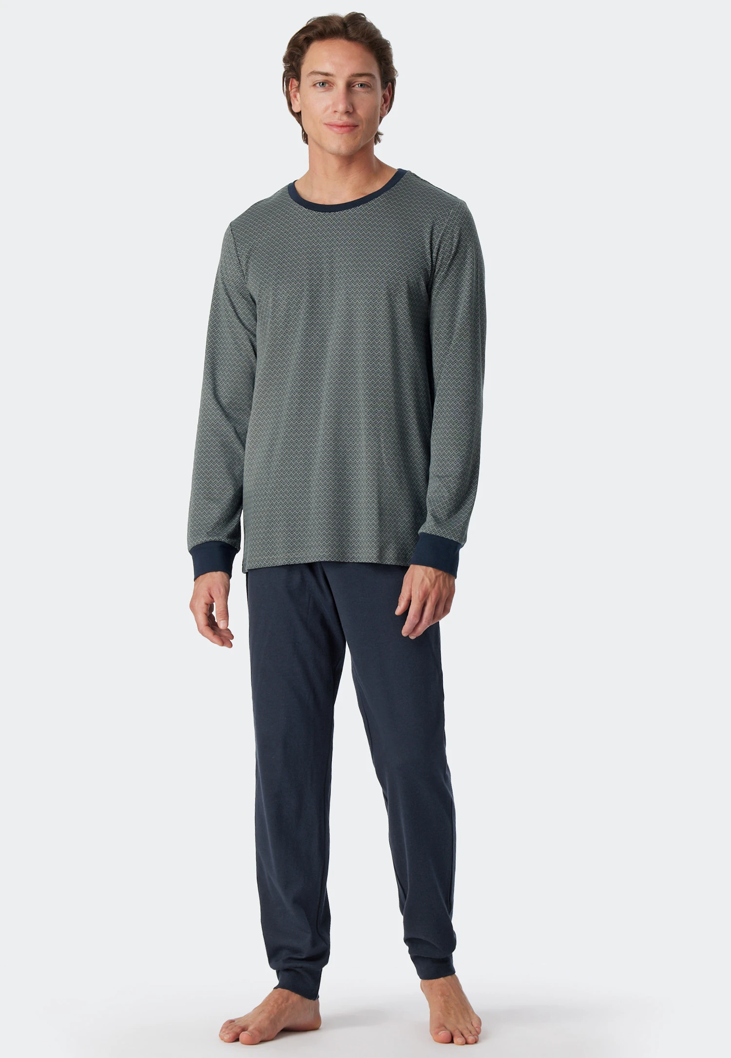 Maximum comfort is the order of the day with these men’s long pajamas. Soft interlock made of 100% cotton feels particularly comfortable and is harmoniously rounded off by the dark blue cuffs. The two-piece set also impresses visually with its slim cut: a gray-green minimal pattern gives the dark blue long-sleeved shirt with tone-on-tone crew neck a pure, elegant look. All that’s left is the dark blue pajama bottoms and the best SCHIESSER quality!