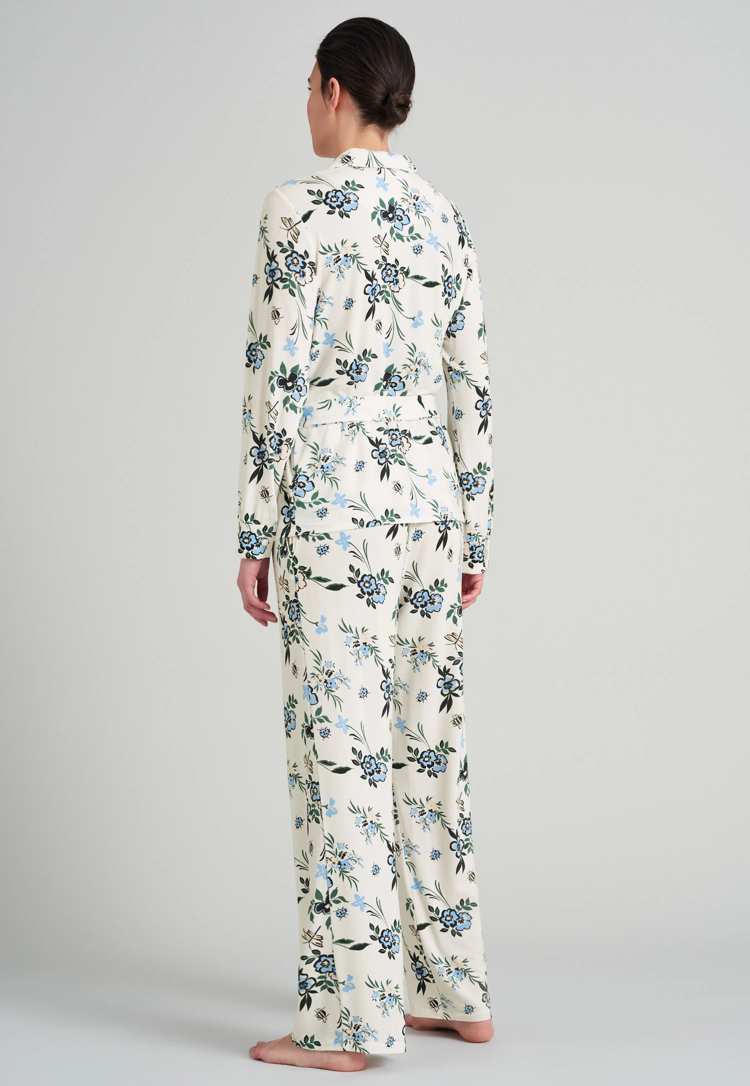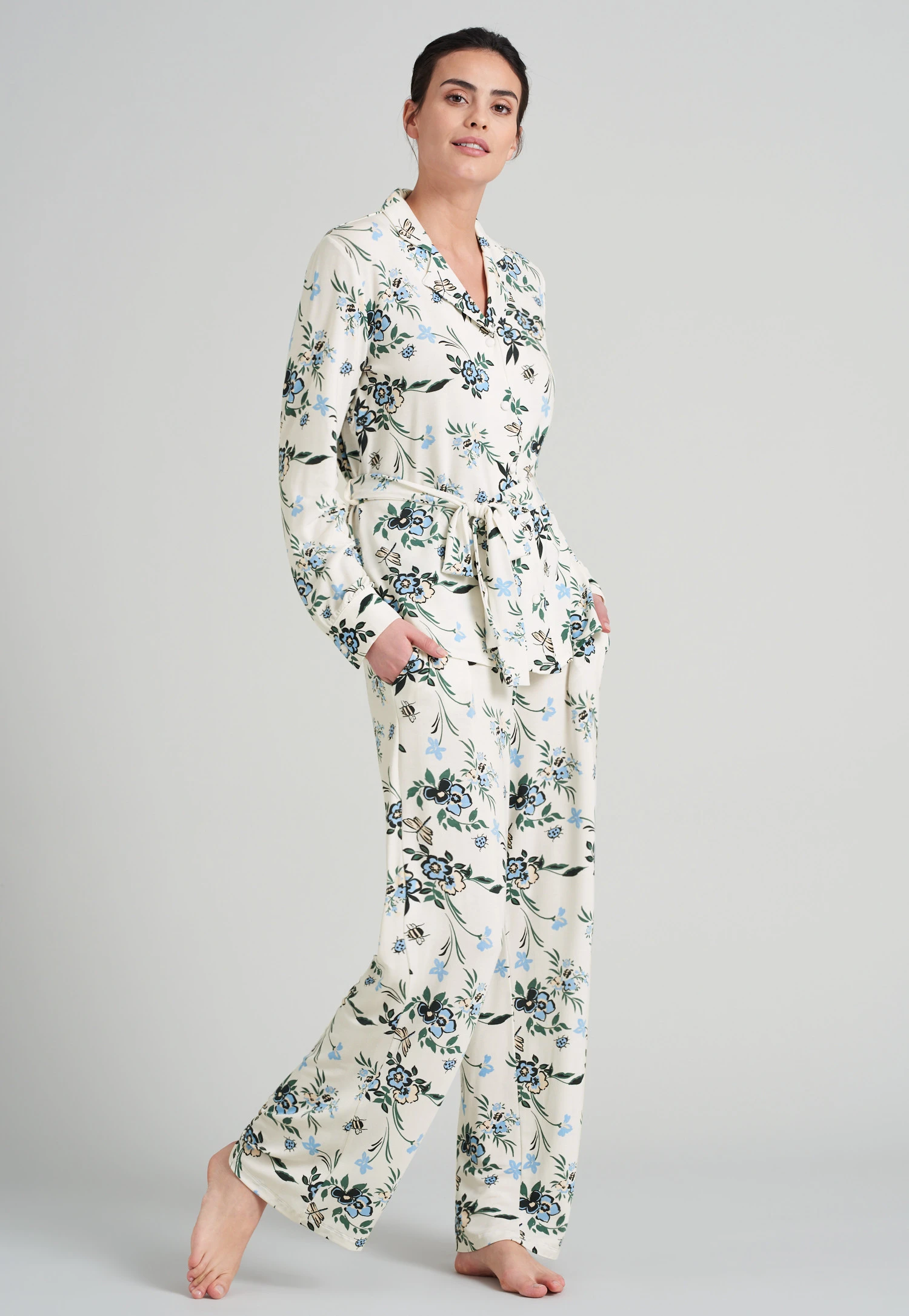 These women’s long pajamas are a romantic favorite! With their floral all-over print, they’re a real eye-catcher! With its classic shirt collar, wide belt and cuffs on the sleeves, the top is as elegant as it is comfortable. The wide, Marlene-style pants with side pockets and elastic waistband go well with this. Soft single jersey made of breathable modal with a balanced proportion of spandex gives you a sense of pure well-being. Best SCHIESSER quality!