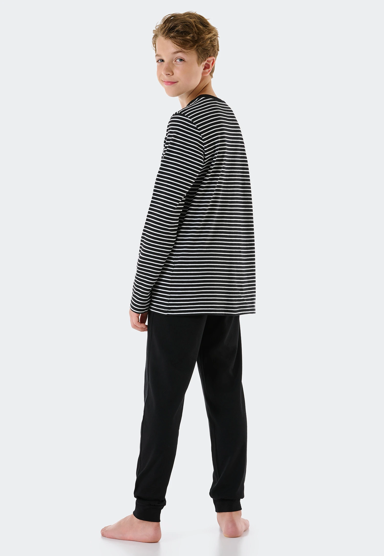 These long pajamas are just the thing for cool boys. The top is a real eye-catcher with its black and white block stripes and inspires with a casual “break” motif on the chest. The black pajama pants with their comfortable cuffs fit perfectly against your body and invite you to enjoy sweet, relaxing dreams. Soft single jersey made of 100% organic cotton caresses the skin – in the best SCHIESSER quality, of course!