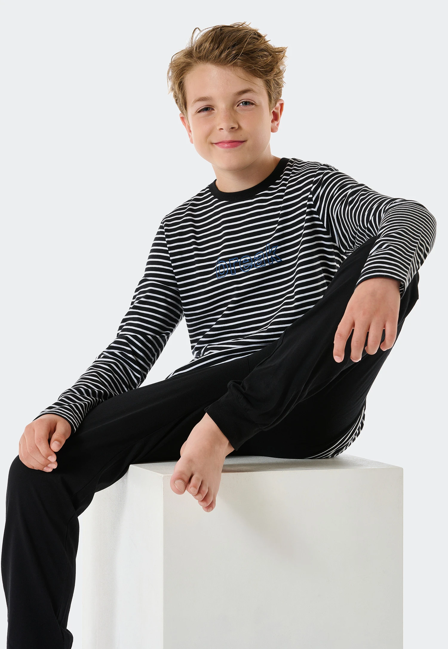 - long pajamas for boys with black and white stripes, black pants and “Break” lettering