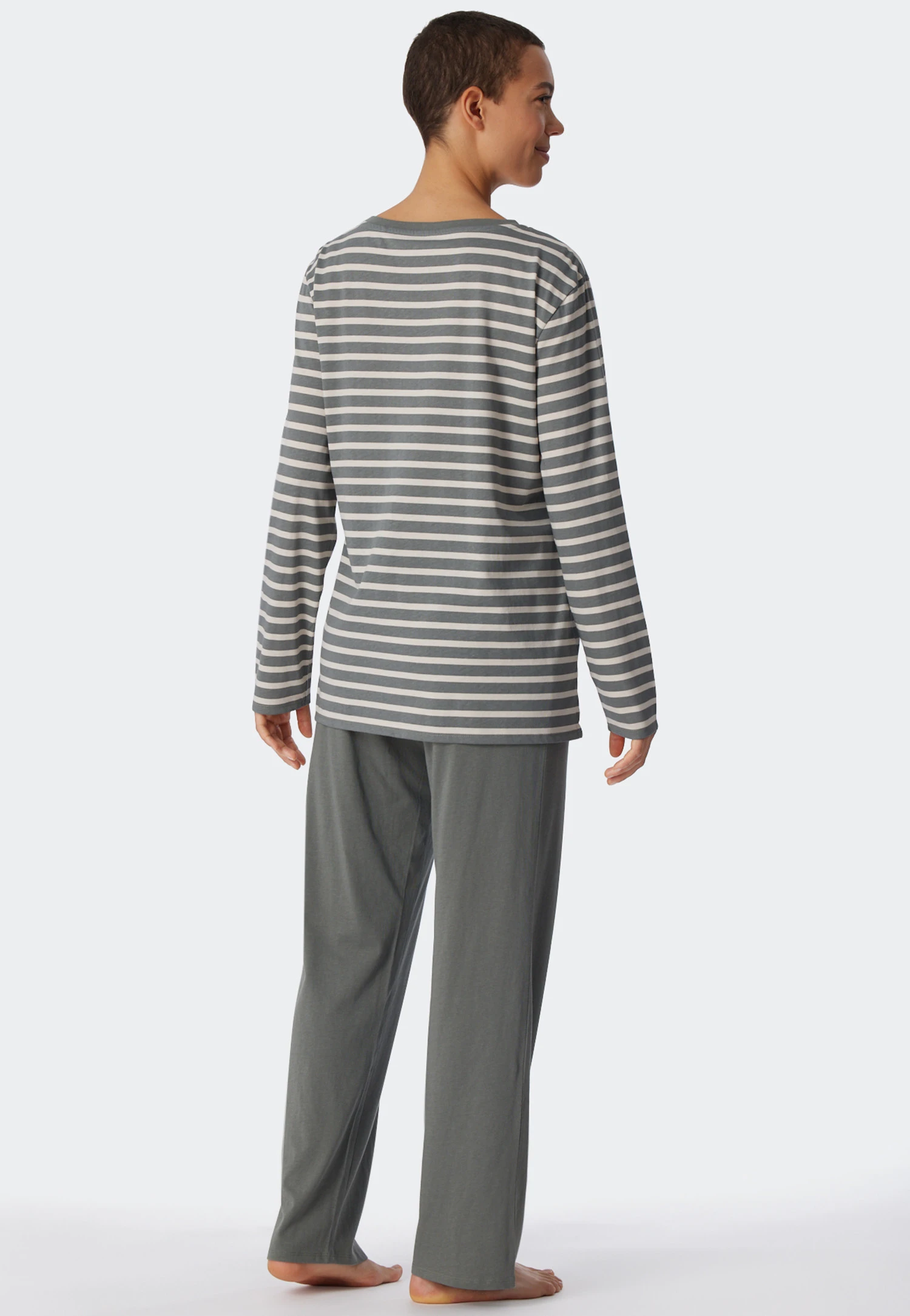 Sporty Breton stripes make up their charm: these women’s long pajamas are a real favorite! With their body-hugging silhouette, they’re incredibly comfortable. The striped shirt not only looks good, but is also comfortable thanks to the slightly wider crew neck and side slits on the hem. The solid-colored pants with elastic waistband go well with this. Soft single jersey made of 100% organic cotton perfects that feeling of well-being. Best SCHIESSER quality!