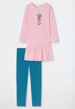 May I have the next dance? These pretty long girls’ pajamas from the popular “Princess Lillifee” nightwear range will enchant all your little dream dancers out there. The pretty polka dot look and extra frills on the hem make the pink top a real eye-catcher. Lillifee herself happily beams out at everyone with cool gold glitter effects on the chest. The comfortable leggings in petrol blue and 100% organic cotton invite you to cuddle up and relax. Beautifully playful in the best SCHIESSER quality!