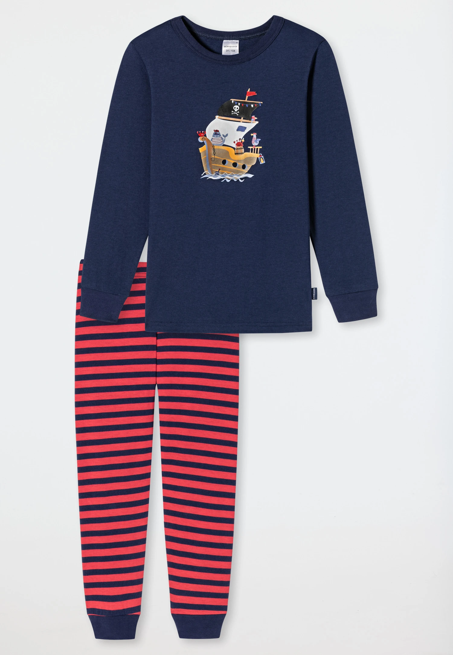 Set sail! These long, dark blue boys’ pajamas are just the thing for all your little pirates. The dark blue top will inspire you with its magnificent pirate ship design that features a funny crew of animals who are setting off on an adventure. Enjoy wonderful relaxation in the comfortable, long pajama pants that come in a striped look and are equipped with comfortable cuffs. A great two-piece set made from 100% organic cotton and a ton of the very best SCHIESSER quality.
