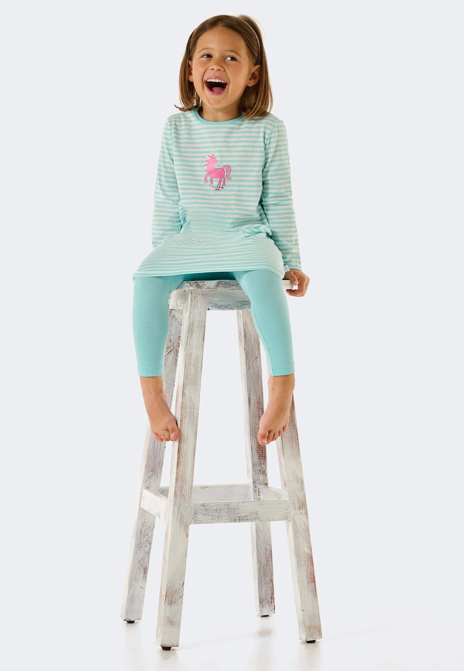 These long girls’ pajamas make going to bed a breeze! The striped sleep shirt will inspire all your little horse fans with a pretty pony on the chest. The solid-color leggings are the perfect match for the top. The soft jersey material made of 100% sustainable cotton makes you feel really good. Simply snuggle up in bed and enjoy sweet dreams in the very best SCHIESSER quality!