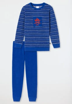 Calling all young pirates: These royal blue, striped boys’ pajamas from the popular “Capt’n Sharky” line are made of soft terry cloth and natural organic cotton that’ll keep you warm all over. A cool red shark with sabers beams out at us from the chest, creating a real sense of adventure. The pajama pants with a soft waistband feature a particularly comfortable fit, and the practical arm and leg cuffs guarantee relaxed adventures in the land of dreams – all with an extra portion of the very best SCHIESSER quality, of course.