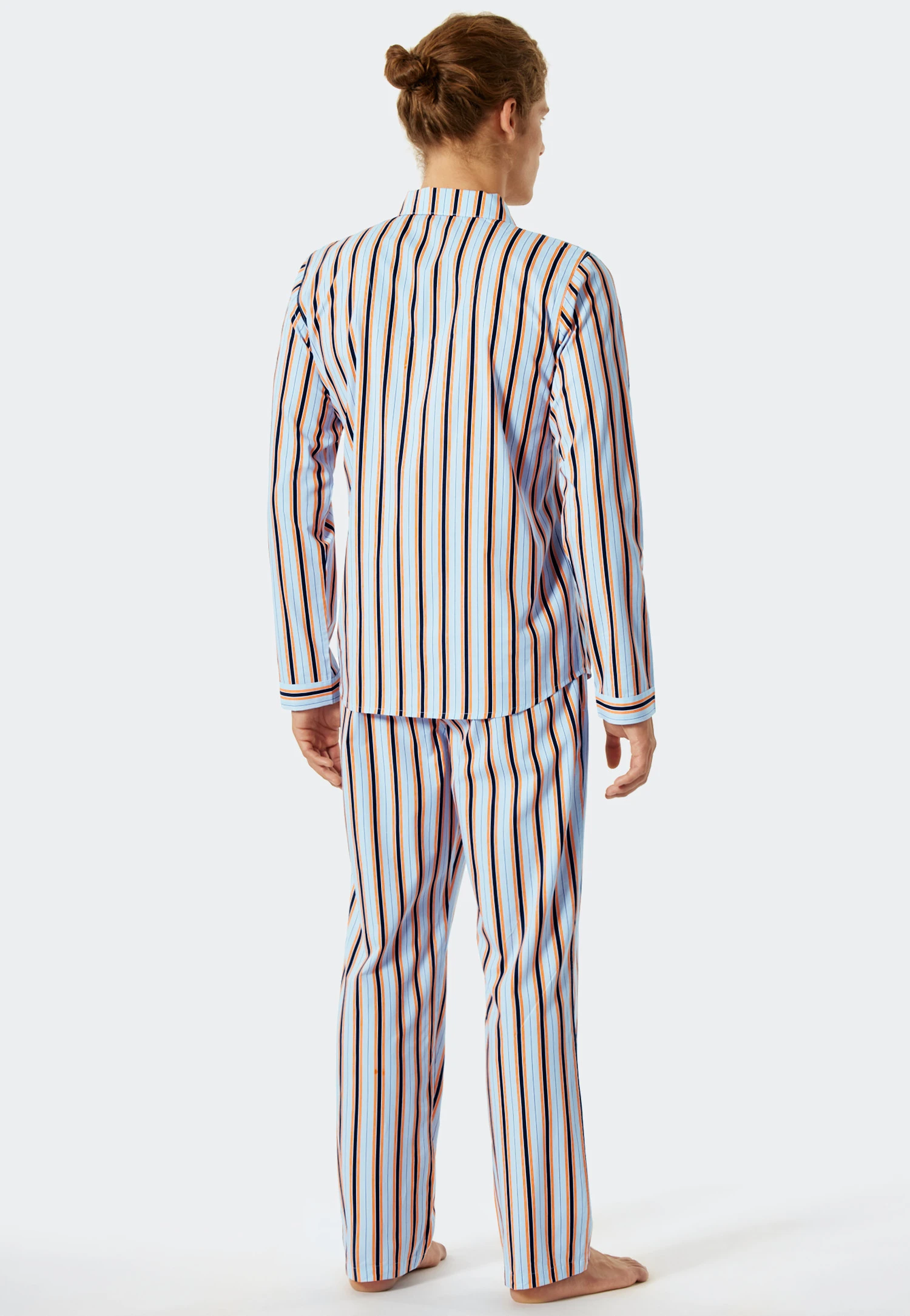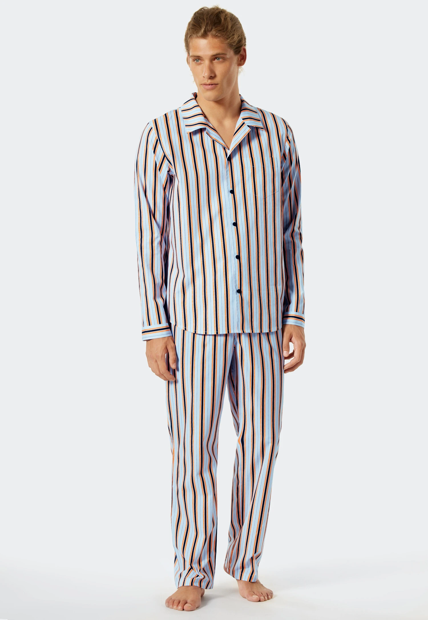 - long pajamas for men in air blue with stripes in orange, dark blue and white