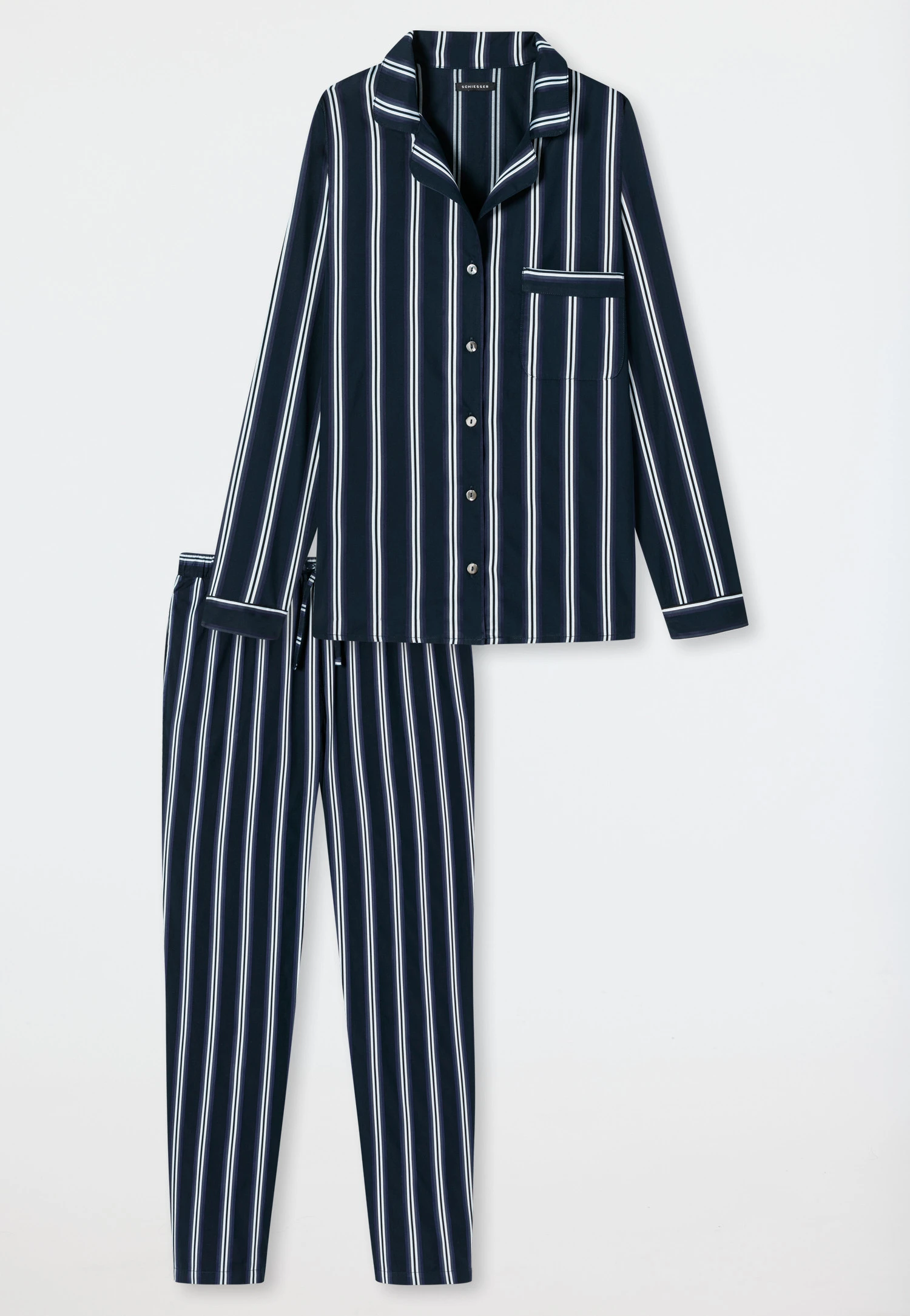 You like it classical? Then you’ll love these women’s long pajamas! They’ll win you over with its high-quality woven stripes in a retro look. The top with lapel collar, full-length button placket and cuffs on the sleeves matches the elegant style. The pants are wonderfully comfortable thanks to the elastic waistband with drawstring and side pockets. The icing on the cake is the material: 100% cotton woven satin has an elegant sheen and feels wonderful. Best SCHIESSER quality!