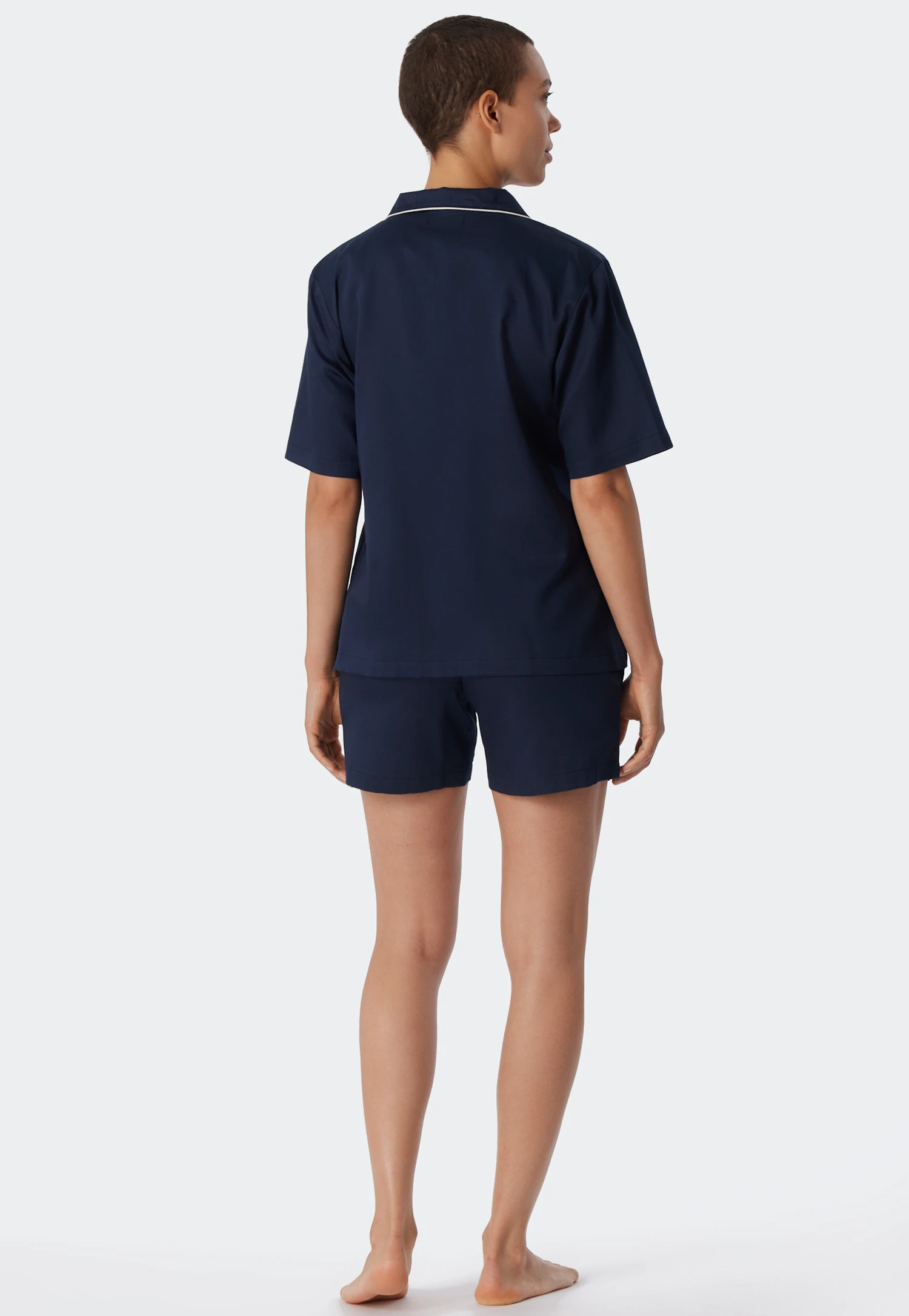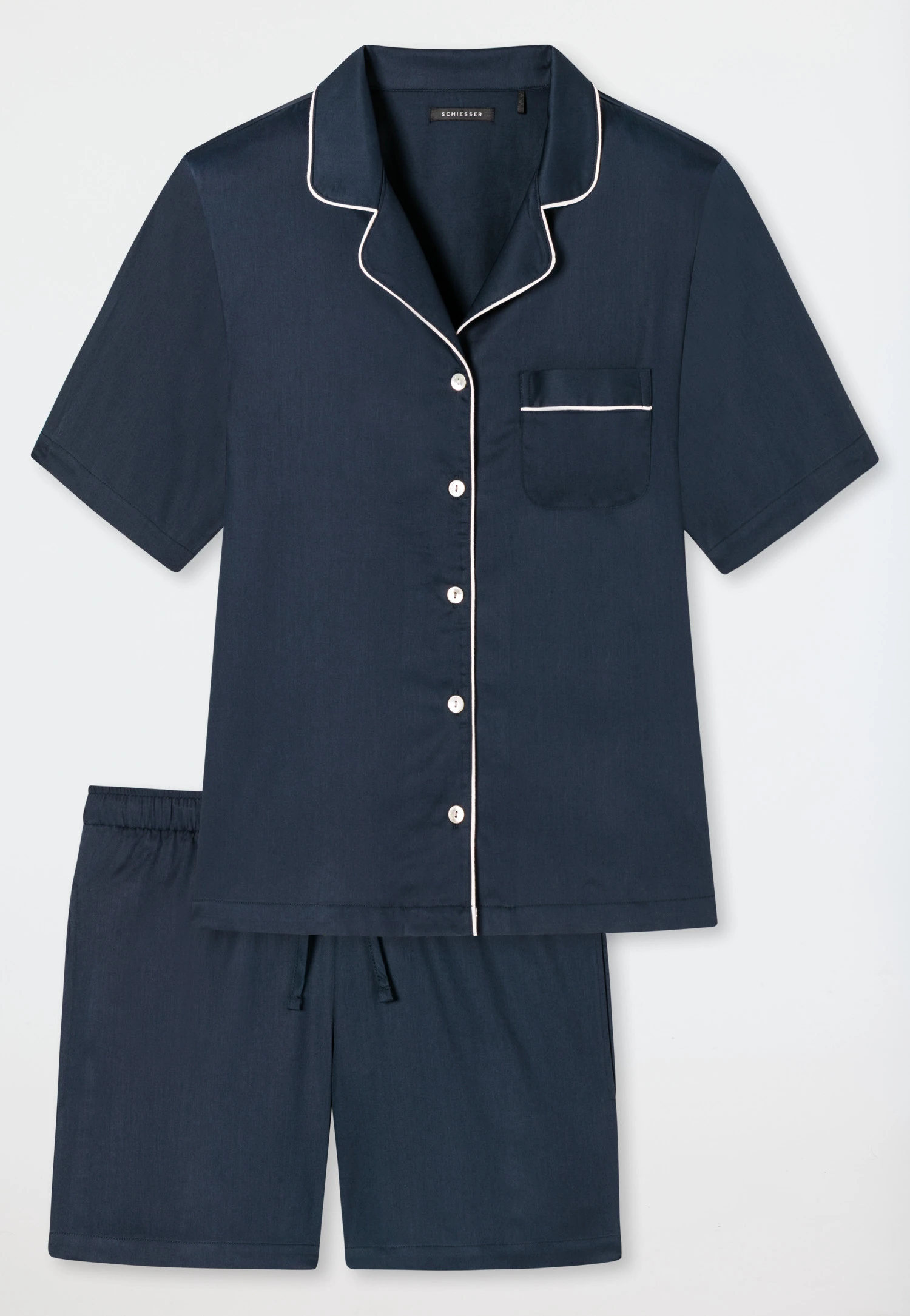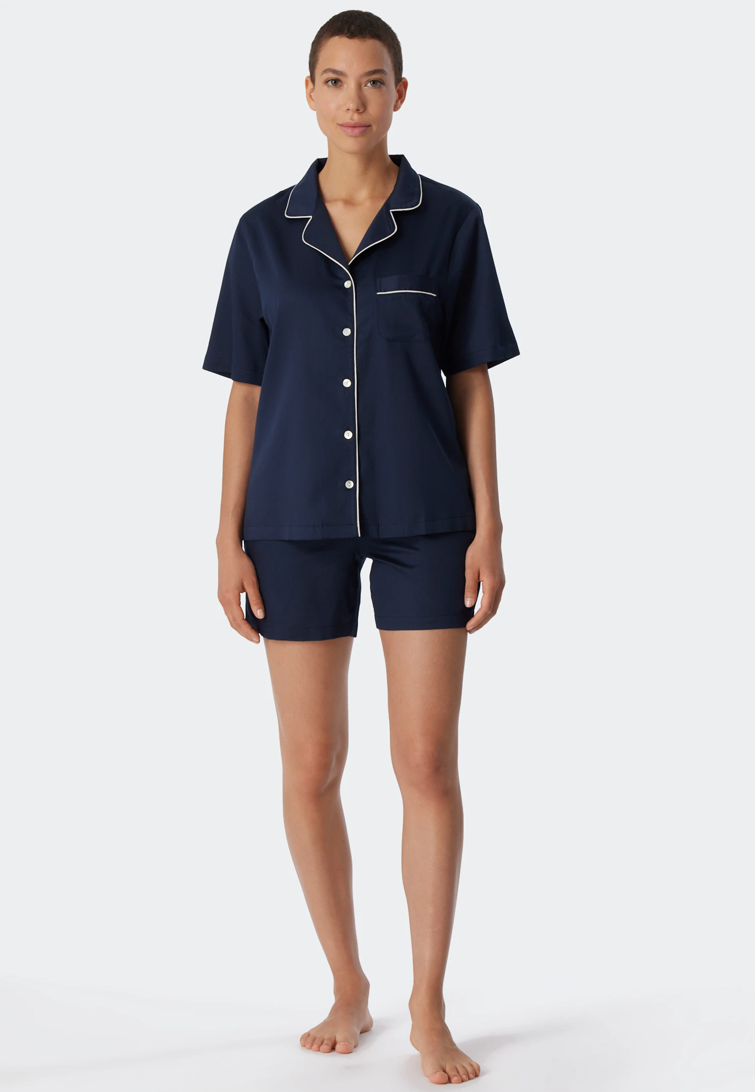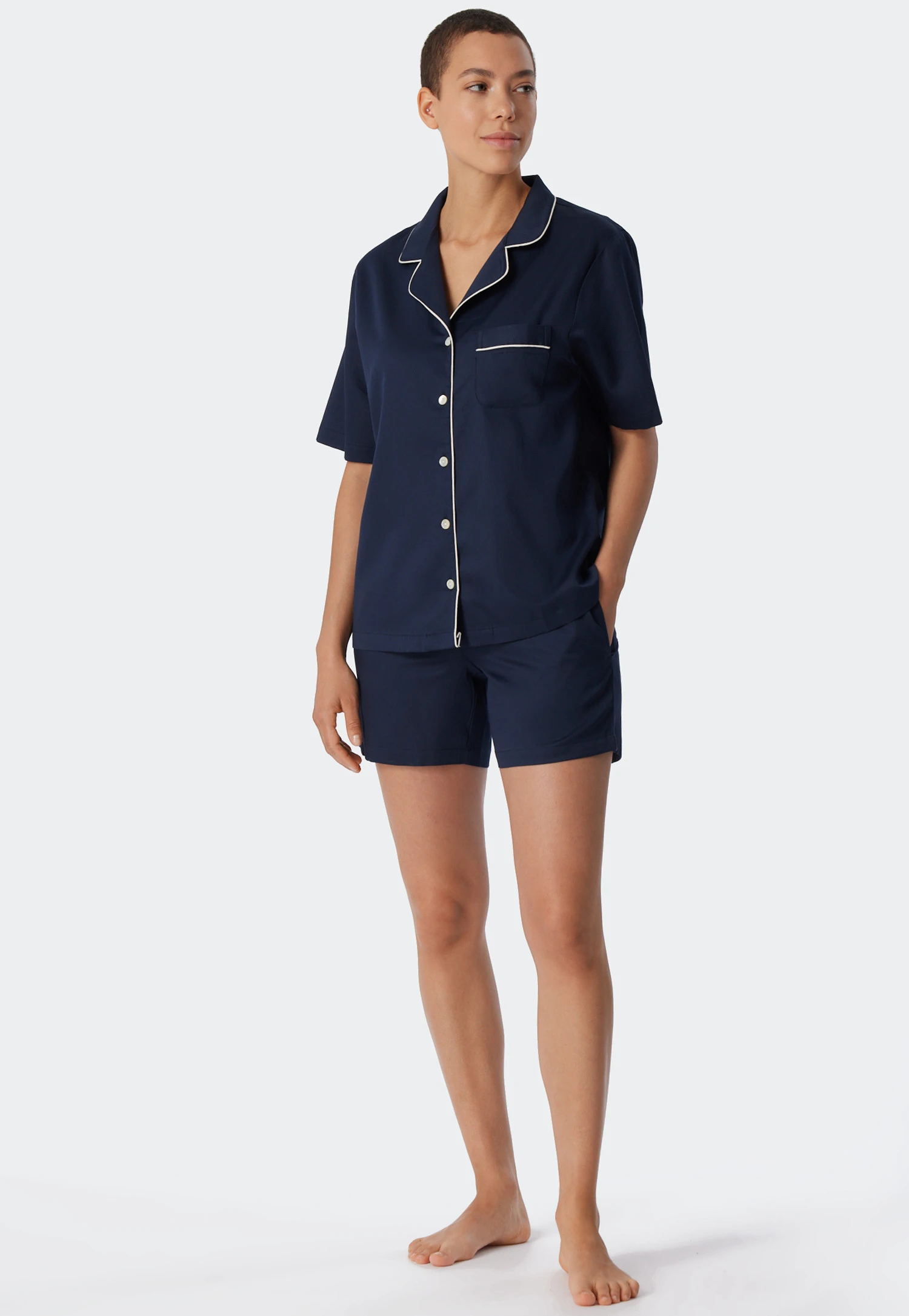 These short women’s pajamas are a stylish companion at night! They radiate classic elegance with their fine piping that features on the lapel collar, the continuous button placket and on the pocket on the chest. They’re complemented perfectly by the short pants with a comfortable, stretchy waistband and pockets. The high-quality material rounds out the look to perfection. In fact, the lightweight woven satin made from 100% cotton features a silky sheen and feels comfortable on your skin. The best SCHIESSER quality for the highest demands!