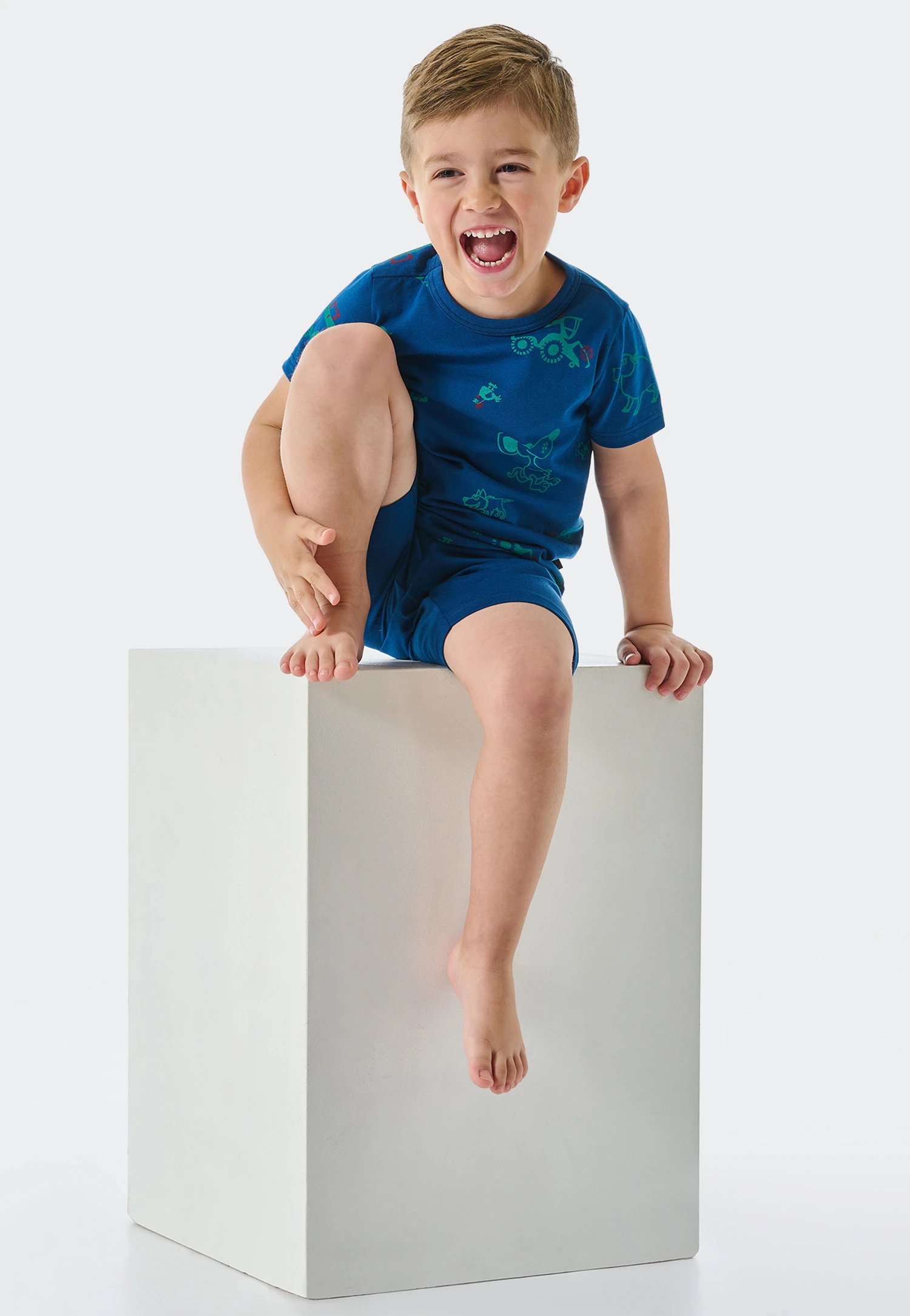 Watch out, here come your new favorite short boys’ pajamas in cool dark blue! The top in a casual cut inspires with its animal all-over pattern in green: funny farm animals and tractors are sure to put everyone in a good mood at bedtime. The single jersey material made from 100% soft organic cotton also feels wonderfully soft on the skin. The dark blue sleep shorts fit comfortably all round thanks to the soft waistband. A great two-piece set for your little rascals in the best SCHIESSER quality.