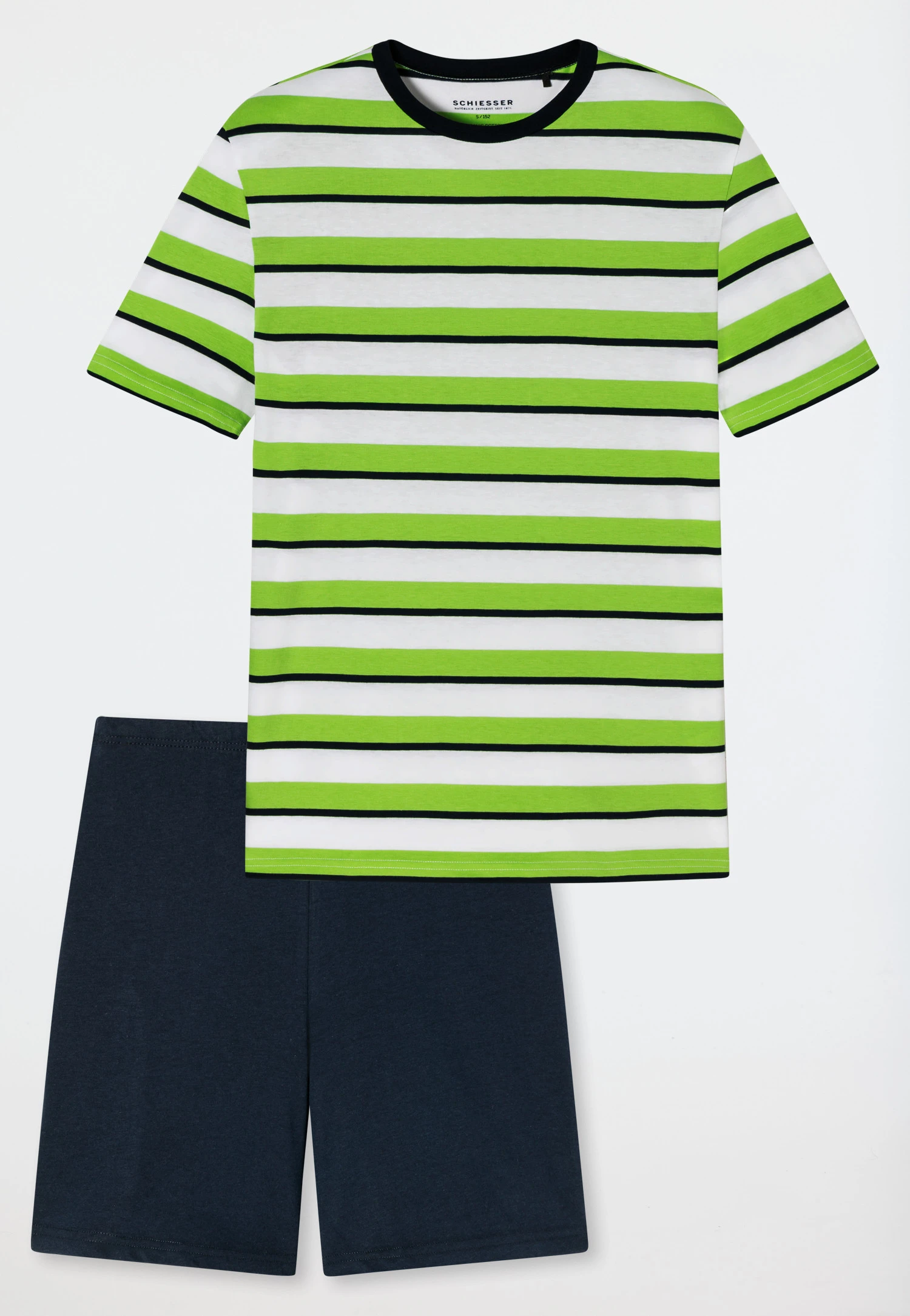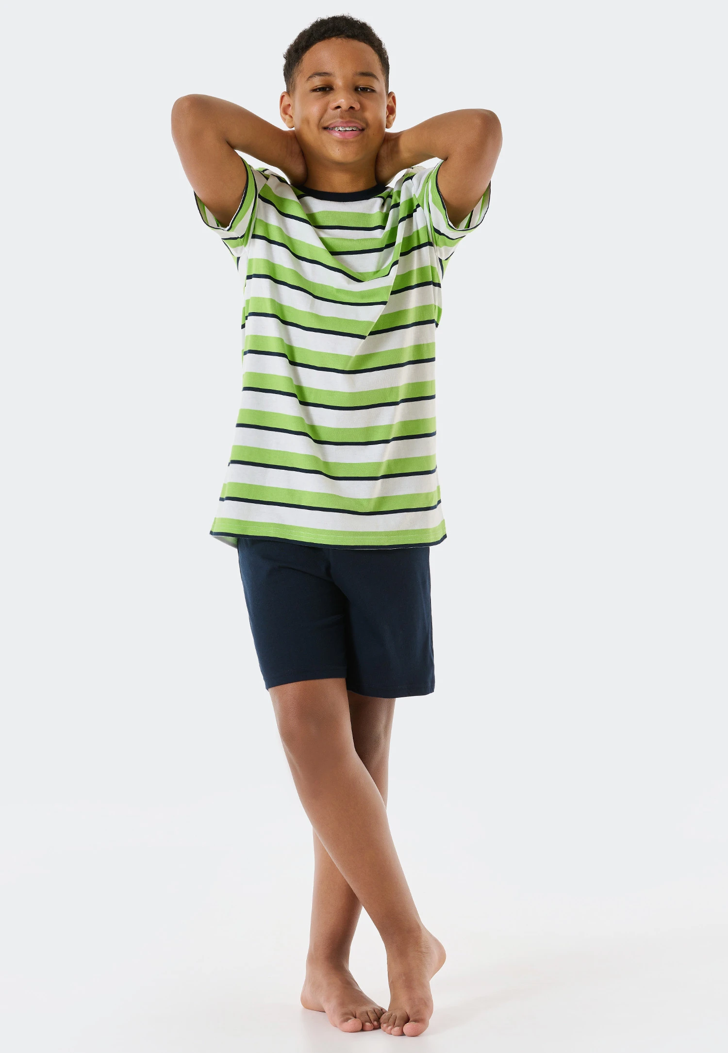 - short pajamas for boys with block stripes in lime green, white and dark blue