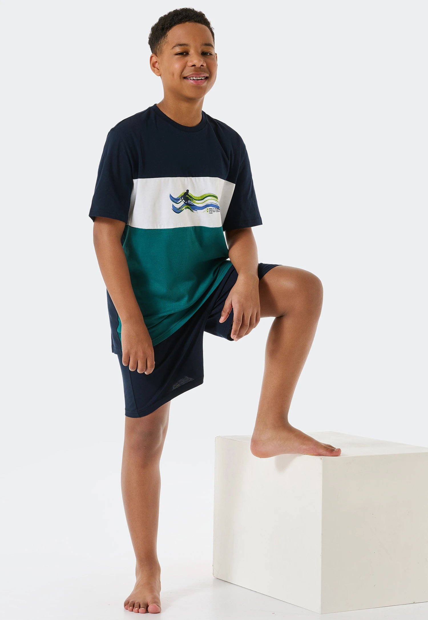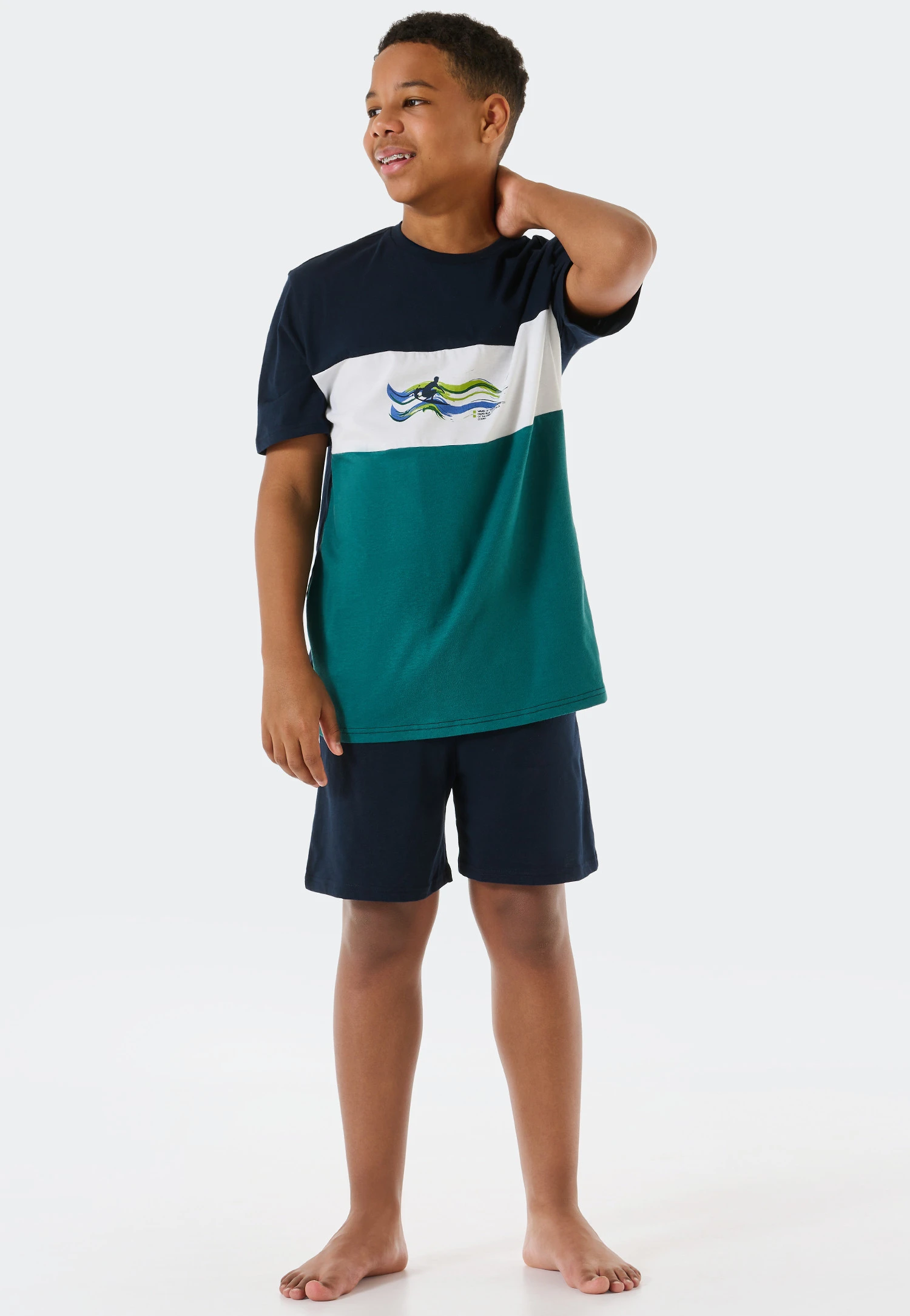 These boys’ short pajamas are just the thing for sports-loving boys! The t-shirt is super stylish with its cool color blocking effect in dark green, white and dark blue. A colorful surfer motif with waves on the chest ensures a good mood. Thanks to the use of pure organic cotton, the dark blue bottoms are comfortable and are just begging for you to relax – in the best SCHIESSER quality, of course!