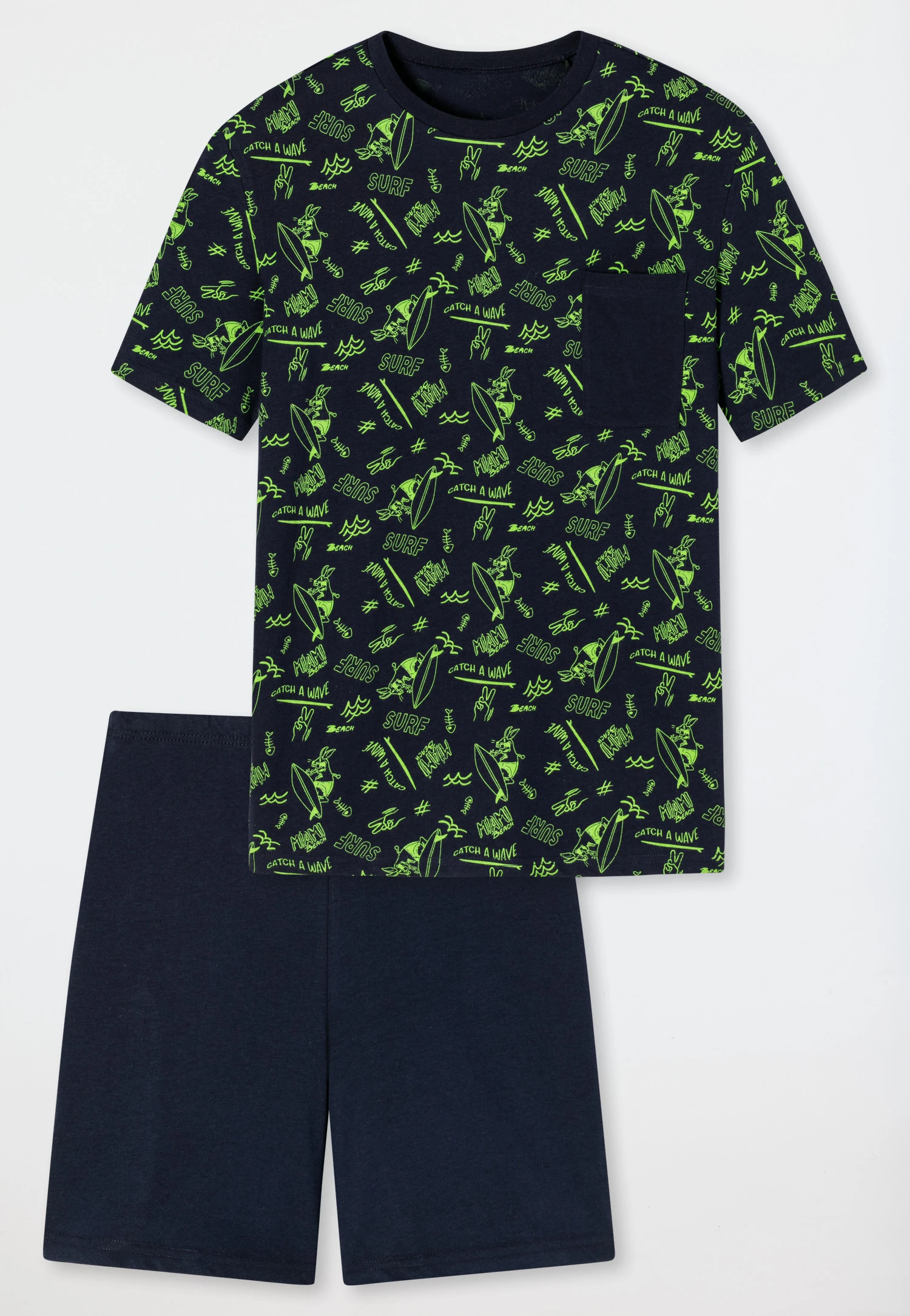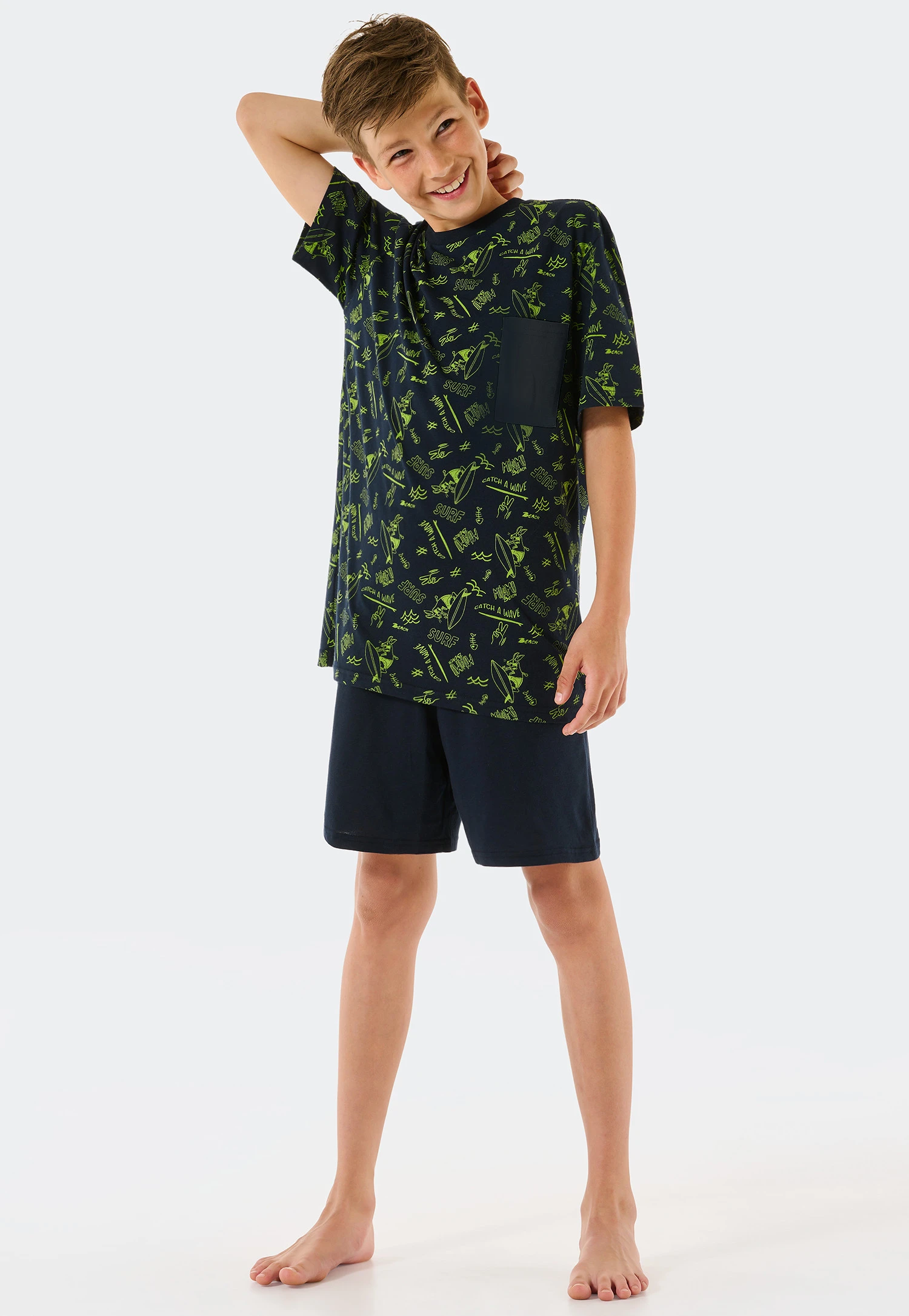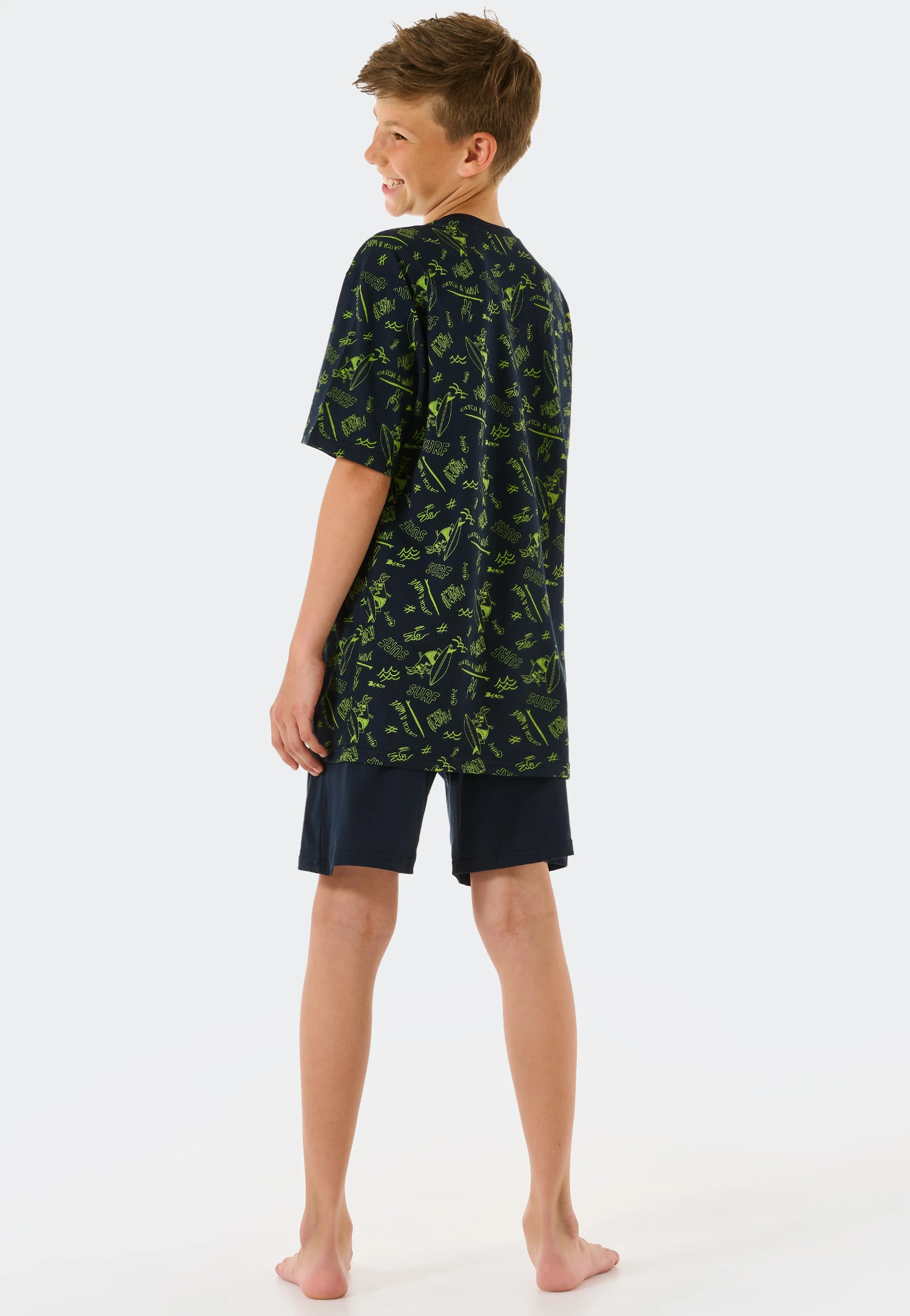 - boys’ short pajamas with dark blue t-shirt and lime-green surfer motifs