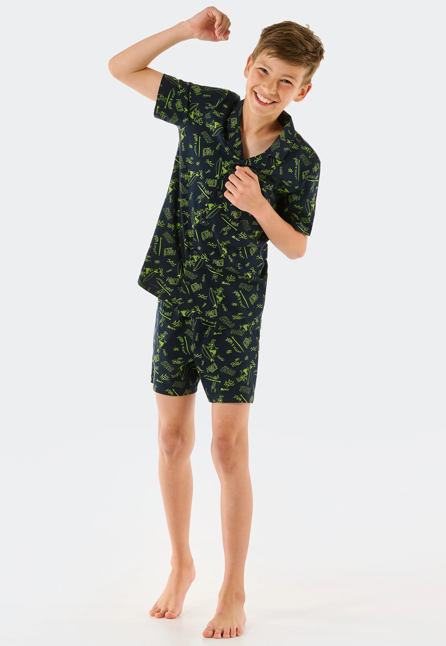 Summertime doesn’t get much cooler than with these short, dark blue pajamas for boys. What’s more, they’re sure to put them in a good mood when it’s time to get up! The lime-green surfing animals are a funny highlight on the T-shirt with a shirt collar and a button placket and on the bottoms that feature a comfortable waistband. In soft single jersey made from pure organic cotton, this two-piece set also promises exciting dreams in the best SCHIESSER quality!