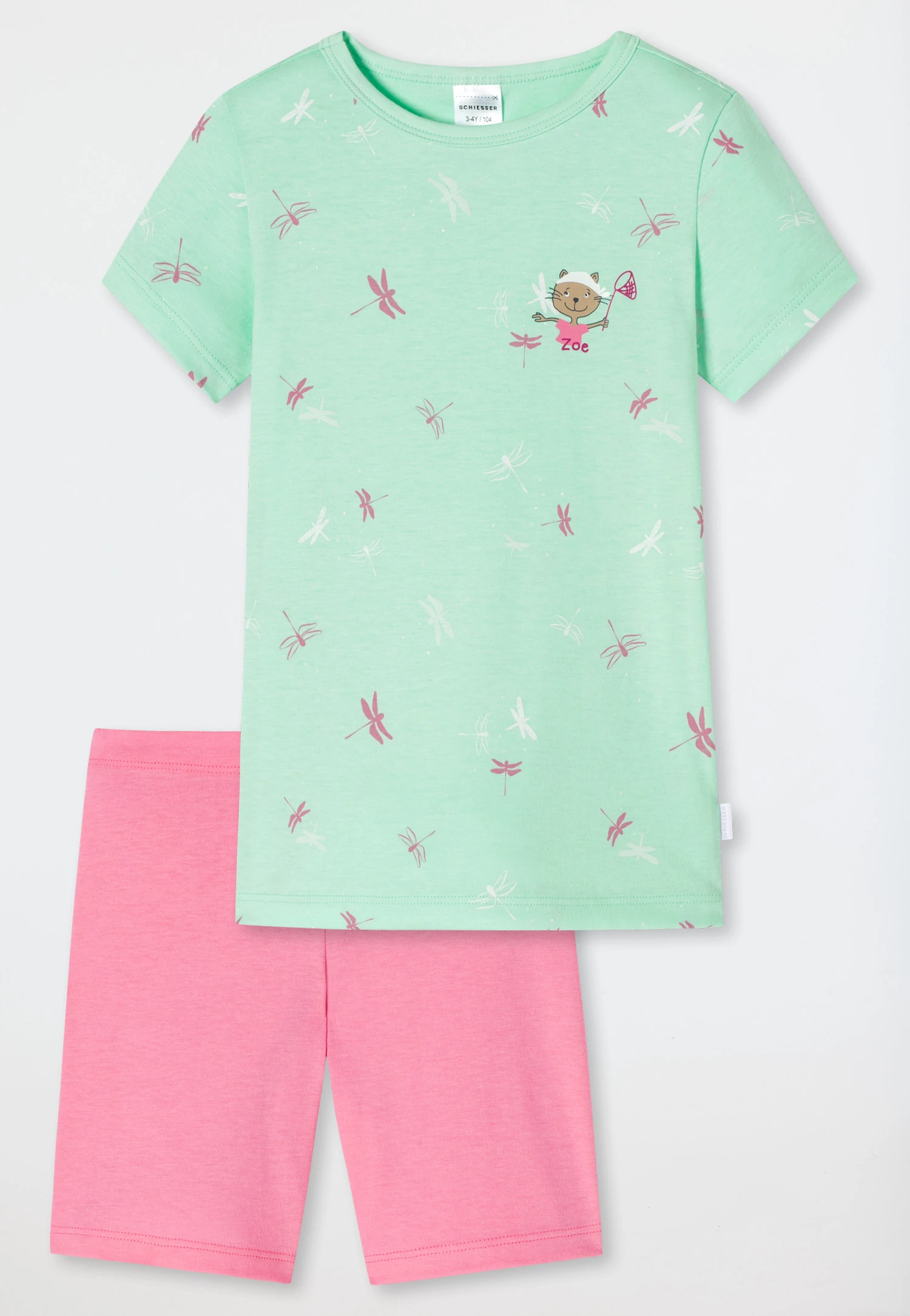 - short girls’ pajamas in mint with a Cat Zoe print and sleep shorts in pink