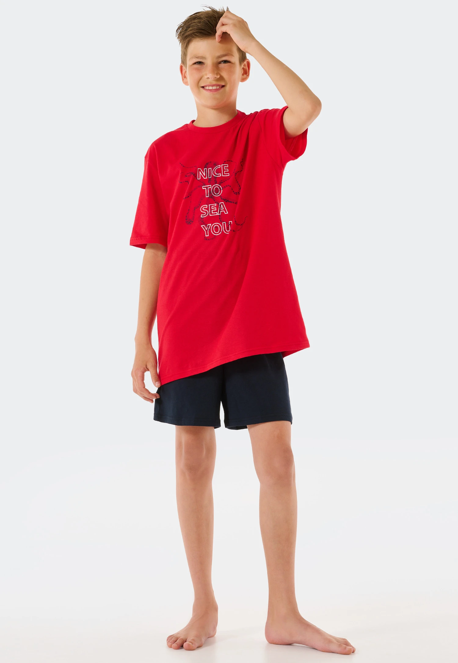 Relax in these boys’ short pajamas. The blue octopus print and the white “NICE TO SEA YOU” lettering add some maritime details to the red T-shirt that features a clean style. The cool two-piece set is rounded off with the dark blue bottoms that also feature a solid-color design. The soft single jersey fabric made from pure organic cotton is also perfect for making yourself totally comfortable in the evenings. Casual pajamas in the best SCHIESSER quality!
