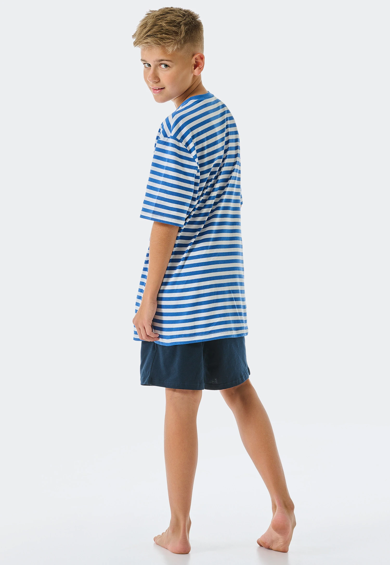 - short pajamas for boys with striped t-shirt in aqua blue and white