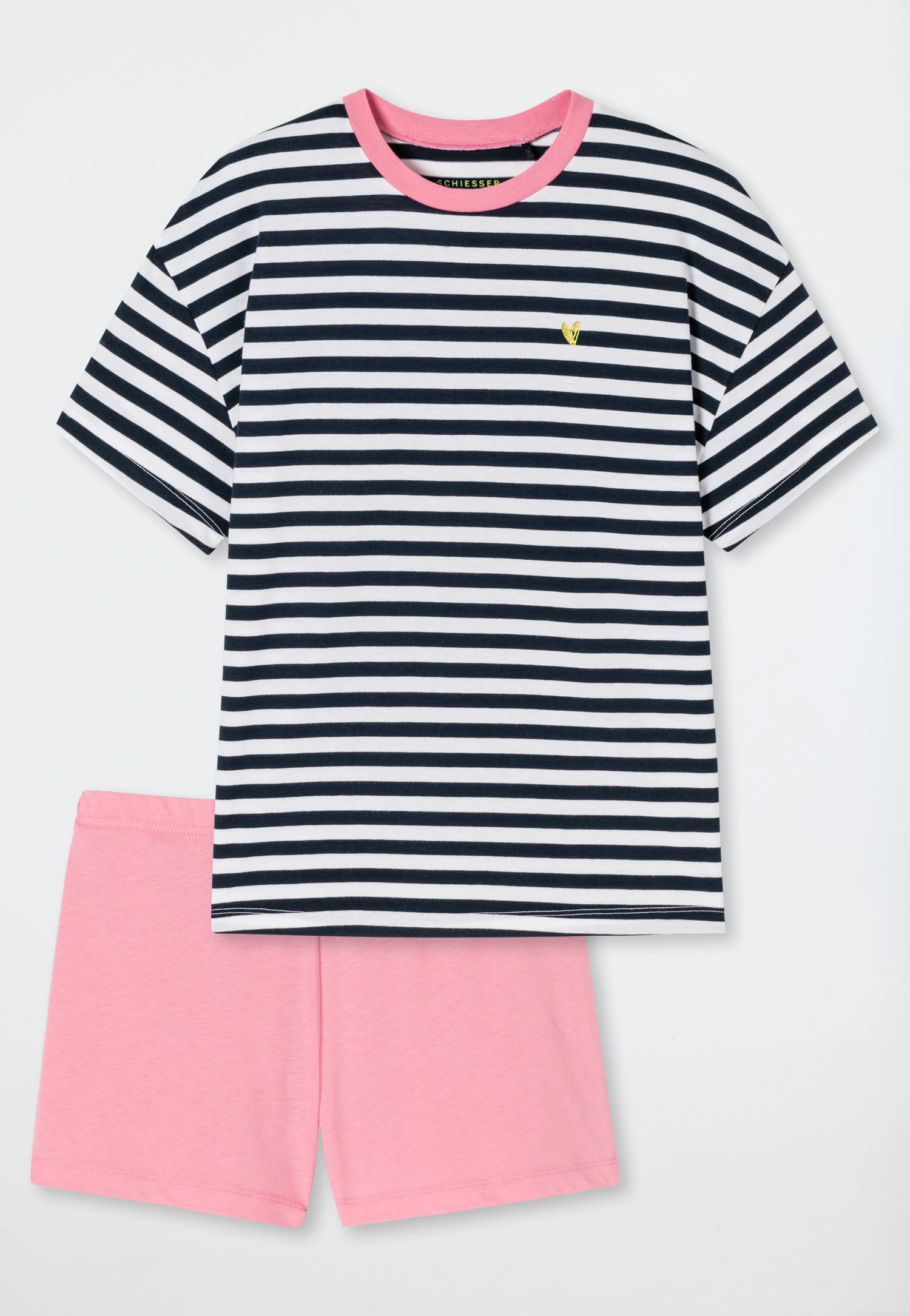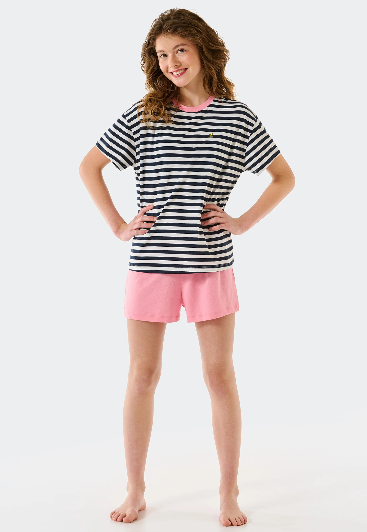- short pajamas for girls with a dark blue and white striped shirt and bottoms in pink