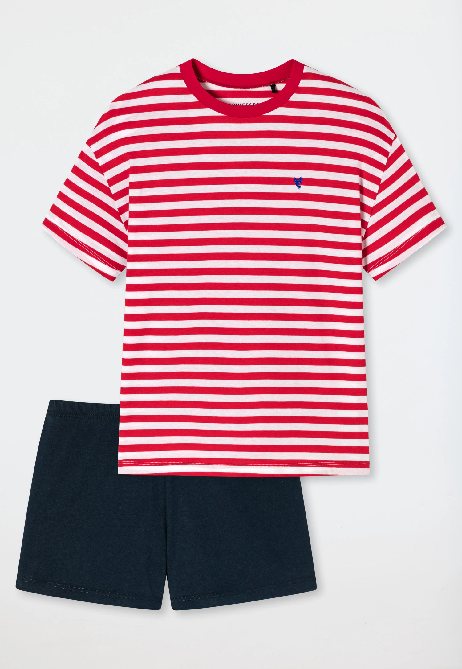 - short pajamas for girls with red and white striped shirt and bottoms in dark blue