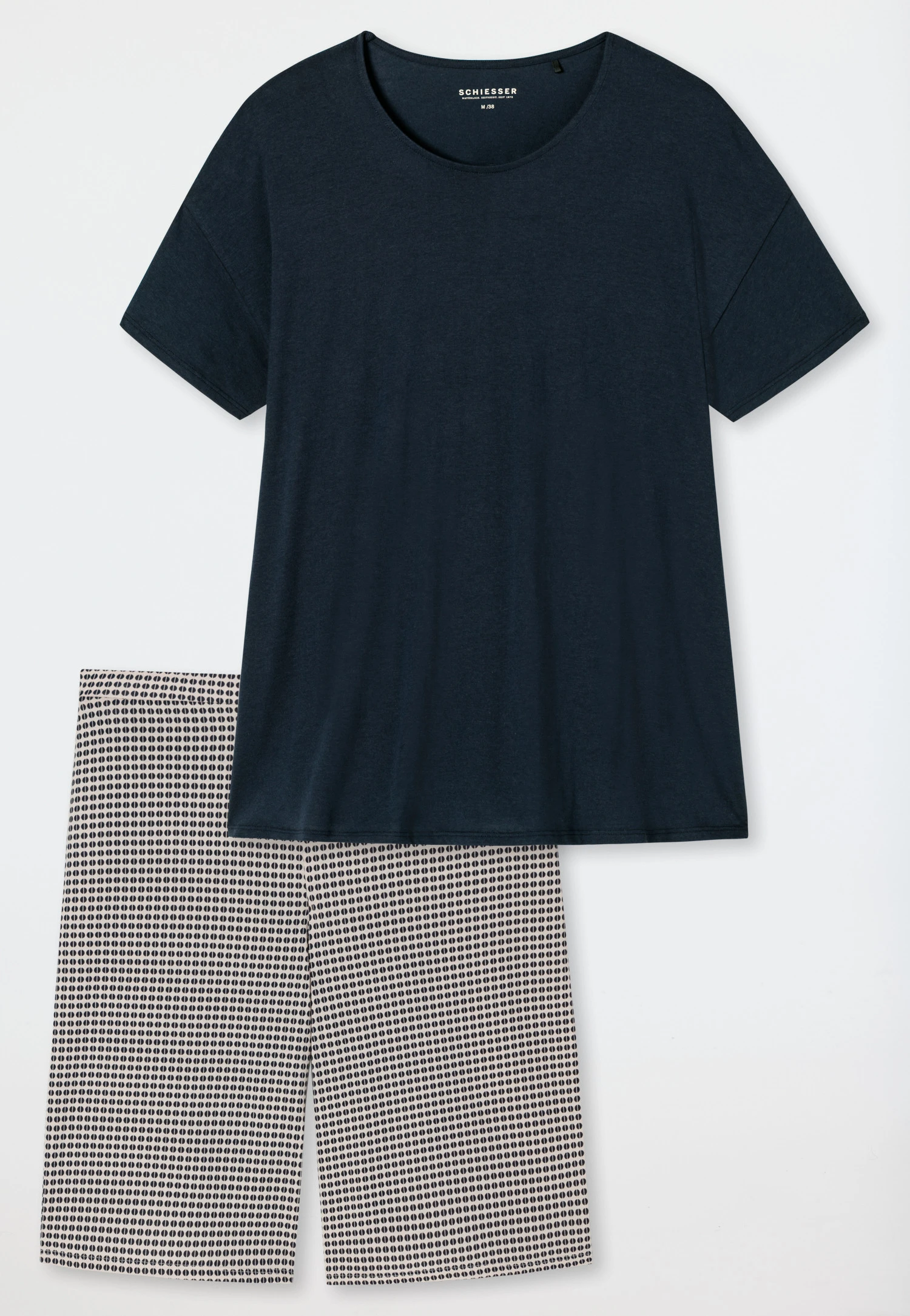So comfortable, so soft: these women’s short pajamas guarantee relaxing nights! Their modern silhouette offer plenty of freedom of movement. The solid-colored T-shirt has a casual A-shape with oversized, wider sleeves. The shorts with elastic waistband are also incredibly comfortable. The minimalist graphic print acts as a real eye-catcher. Not to mention you’ll love the material: sustainable single jersey made from organic cotton and modal feels wonderfully soft on the skin. Best SCHIESSER quality!