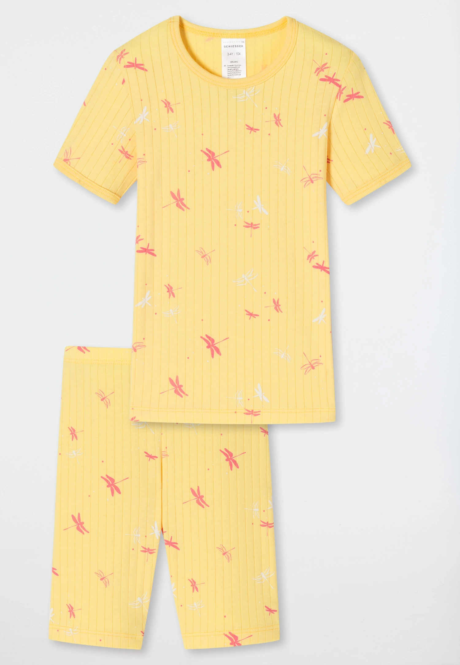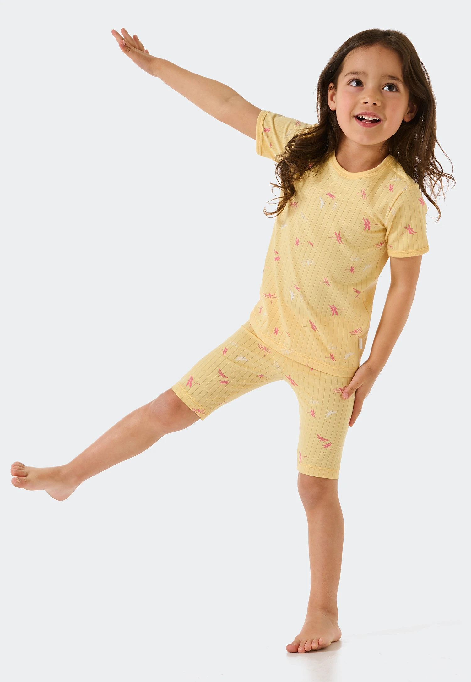 These short, vanilla-color girls’ pajamas are a real summer dream! The natural, ribbed Tencel material not only feels particularly soft on the skin, but also ensures a top-class wearing experience and a great deal of comfort all-round. The all-over pattern of small dragonflies in white and pink is sure to make everyone’s hearts beat a little faster. The close-fitting pajama pants with a soft waistband sit perfectly on the body. For magical, relaxed nights in the best SCHIESSER quality.